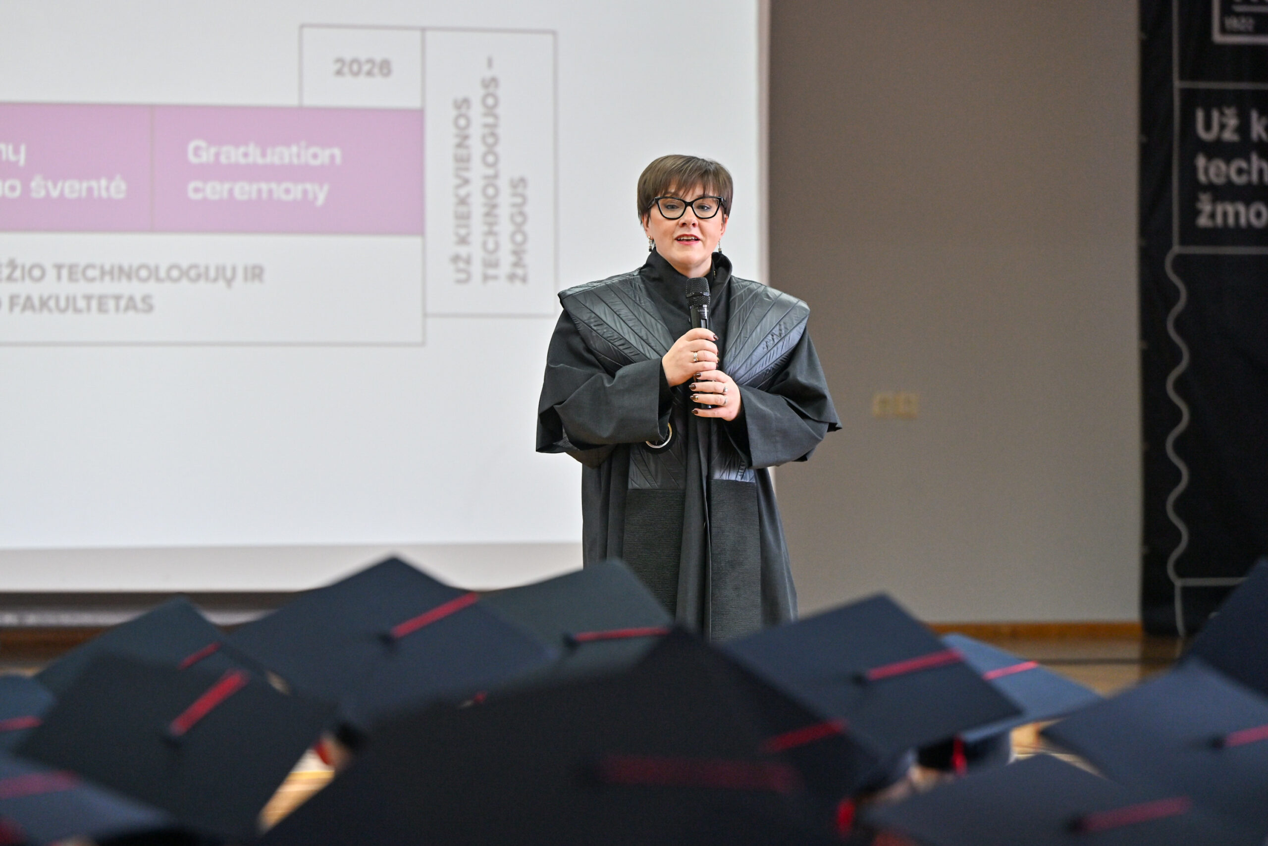 Akademinės bendruomenės vardu absolventus pasveikino fakulteto dekanė, profesorė daktarė Daiva Žostautienė, akcentuodama mokslo ir žmogiškųjų vertybių dermę.