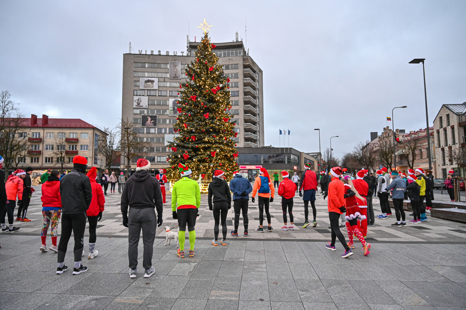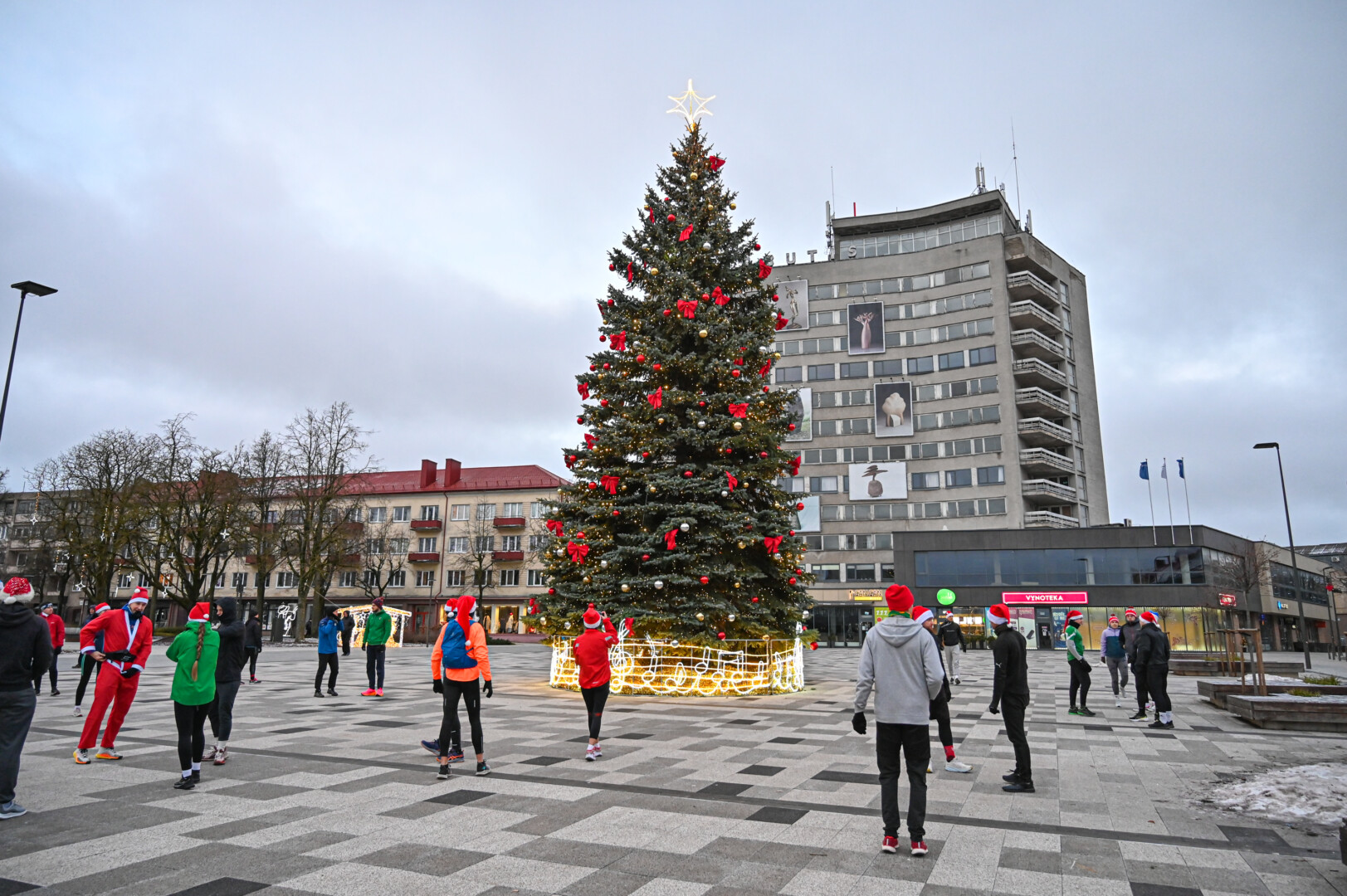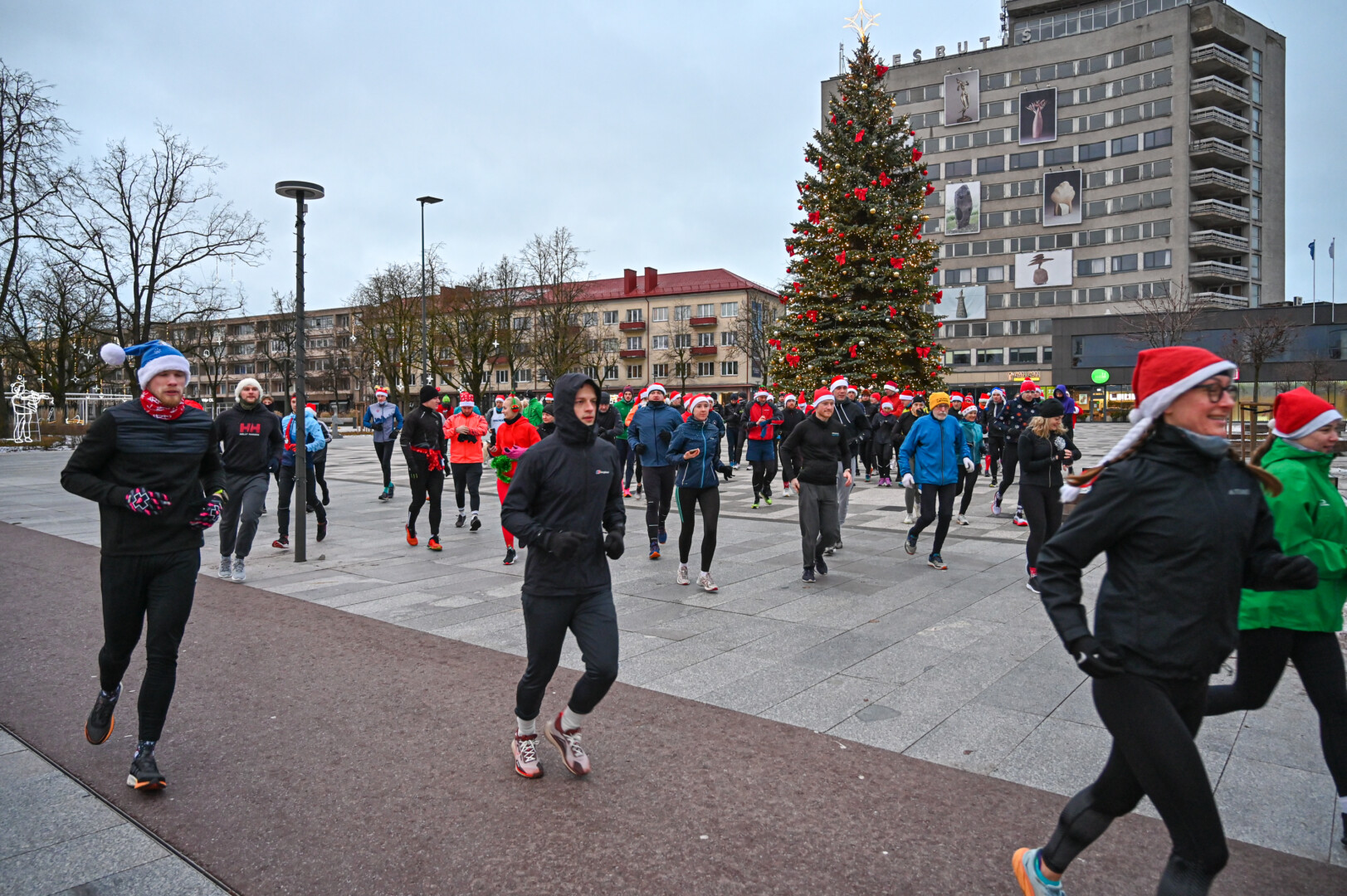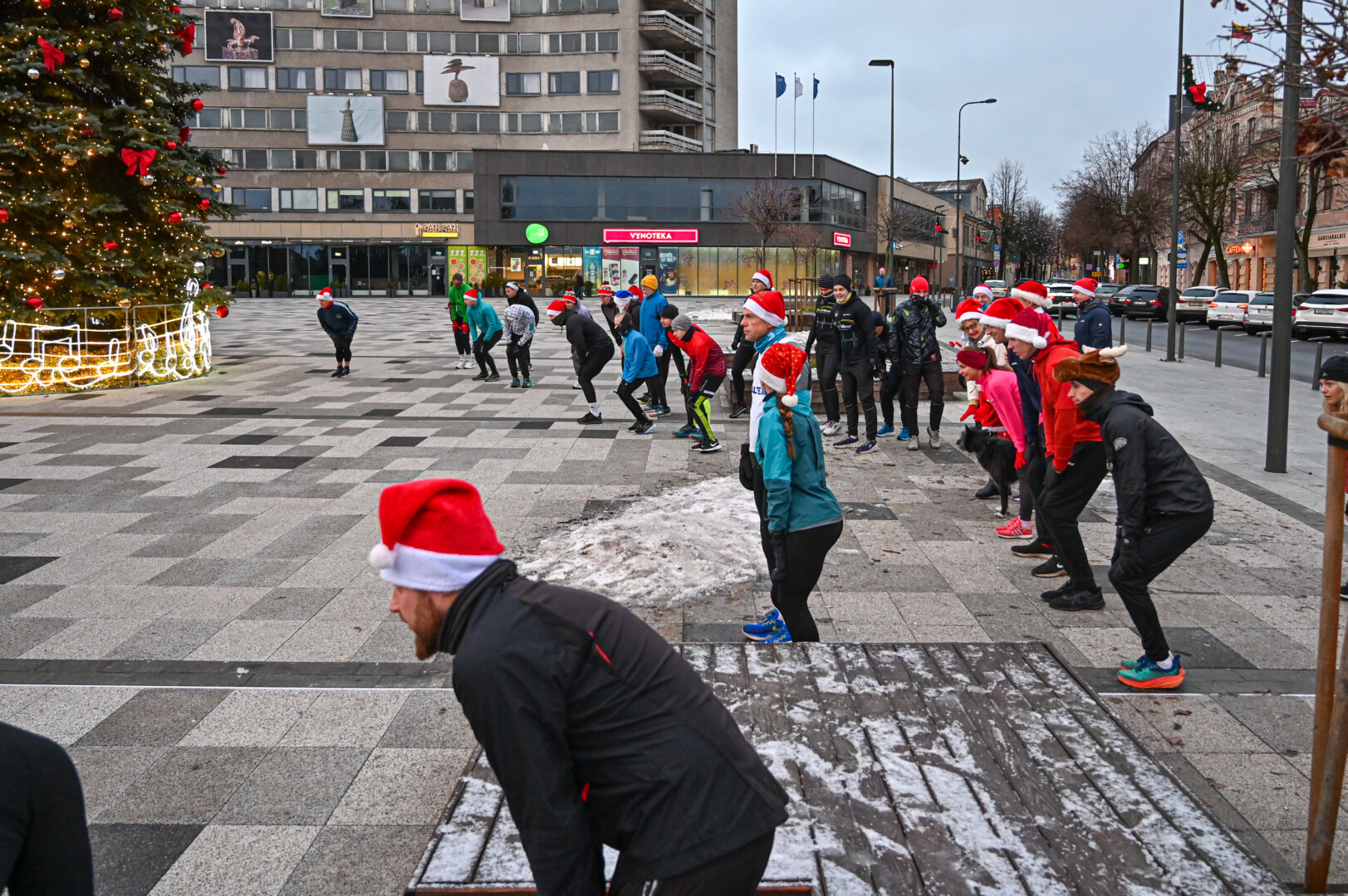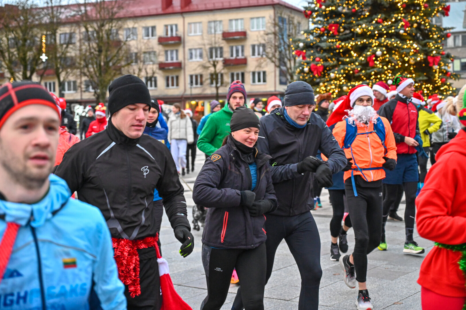 Kūčių dienos rytą kone šimtas entuziastų Laisvės aikštėje prie girliandomis mirgančios eglės startavo kalėdiniam bėgimui per miestą.