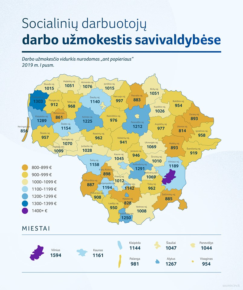 Socialinių darbuotojų atsakomybė visose savivaldybėse ta pati, bet jų atlyginimai skiriasi net dukart. Brangiausiai šie specialistai įvertinti Vilniuje. Čia jų uždarbis siekia 1594 eurus neatskaičius mokesčių. O prasčiausia finansinė padėtis Utenos rajono socialinių darbuotojų, gaunančių 841 eurą popieriuje. Šiose darbo užmokesčio sūpuoklėse Panevėžio miestas ir rajonas laikosi viduryje. Aukštaitijos sostinėje socialiniai darbuotojai uždirba vidutiniškai 1044 eurus neatskaičius mokesčių, rajone porą šimtų eurų daugiau – 1212.