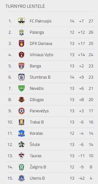 Kiti 14 turo rezultatai: „Vilniaus Vytis“ – Klaipėdos „Koralas“ 1:1, „Tauras“ – DFK „Dainava“ 2:2, Telšių „Džiugas“ – „Šilutė“ 5:1, „Utenis B“ – „Trakai B“ 4:3, „Žalgiris B“ – „Nevėžis“ 1:3.