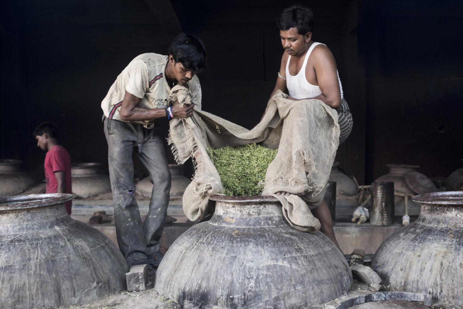 Abdulo Gafooro distiliavimo dirbtuves pirmiau užuodžiau, o tik paskui pamačiau. Siaura gatvele sklido degančios medienos, gėlių, santalų ir prieskonių kvapai. Pro dvivėres duris patekau į erdvę, kurioje ganėsi ožkos ir lesiojo vištos. Tai buvo keistas ūkio ir gamyklos derinys. Erdvaus kiemo viduryje stovėjo dvi eilės didelių varinių puodų, vadinamųjų degų, o greta – šalto vandens sklidinos vėsinimo talpyklos. Kiekvienoje jų gulėjo panardinti ilgakakliai ąsočiai, vadinamosios bhapkos, su santalų aliejumi. Degai ir bhapkos buvo sujungti bambukiniais vamzdžiais, pro kuriuos veržiasi garai.