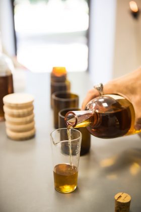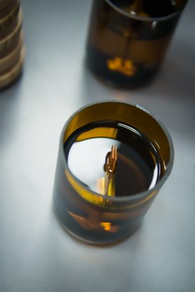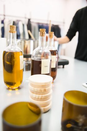 • Ištirpdžius vašką, maišomos kvapiosios medžiagos. Vilius prasitaria, kad yra išbandęs įvairiausias kombinacijas, kol atrado, kurios tinkamiausios norimam efektui pasiekti. Štai, pavyzdžiui, sėkmės žvakėje „Nornos“ pinasi cinamono, mangų ir rytietiškų prieskonių aromatai, o uždegę meilės žvakę užuosime rožių, jazminų ir verbenų dvelksmą. „Kvapiklius vežamės iš Italijos ir renkamės tuos, kurie išskiria kuo mažiau kenksmingų medžiagų ir atitinka visus ekostandartus“, – pasakoja Vilius. Per fotosesiją vaikinai demonstruoja, kaip liejama karjeros sėkmės žvakė „Toras“. Dominuojančios jos kvapo natos yra frankincensas, pačiulis ir laurų aliejus.