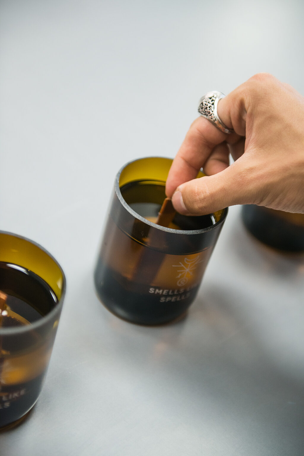 • Žvakės padeda susikaupti, suteikia pozityvios energijos. Kasdieninei meditacijai „Smells Like Spells“ siūlo deginti nespalvotas, runomis nepaženklintas žvakes stikliniuose induose.