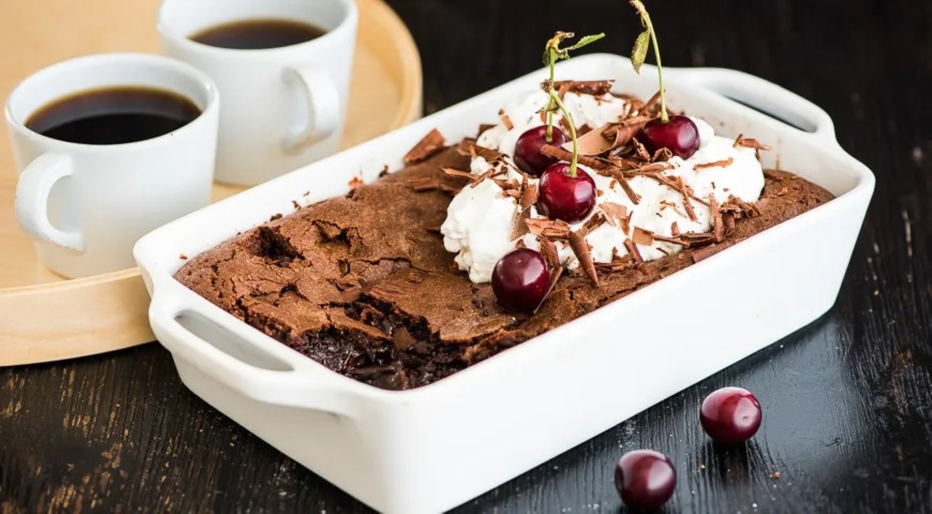 Reikės (10 porcijų): 150 g sviesto, 200 g juodojo šokolado, 200 g kakavos miltelių, 3 kiaušinių, 170 g cukraus, 30 g rudojo cukraus, 0,5 šaukštelio vanilės ekstrakto, 130 g miltų, 1/4 šaukštelio druskos, 200 g šaldytų vyšnių be kauliukų.