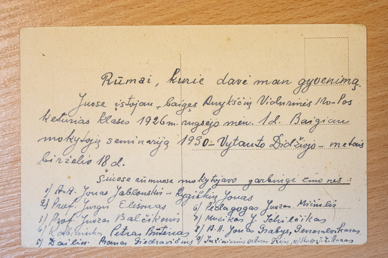 „Nors nėra aišku, kas rašė tekstą, bet jame sutelpa kone visa žmogaus gyvenimo istorija. Kaip vertinami ketveri mokslo metai, koks pasididžiavimas! Reikėtų tik priminti, kad tarpukariu mokytojavimas buvo išties prestižinė profesija. Įdomu ir tai, kad mokytojų seminarija vadinta rūmais. Neįprasta dabartiniams laikams, nors sklaidydama senus atvirukus ir nuotraukas pastebiu tendenciją visus didesnius pastatus taip vadinti“, – pasakoja A. Laumytė.