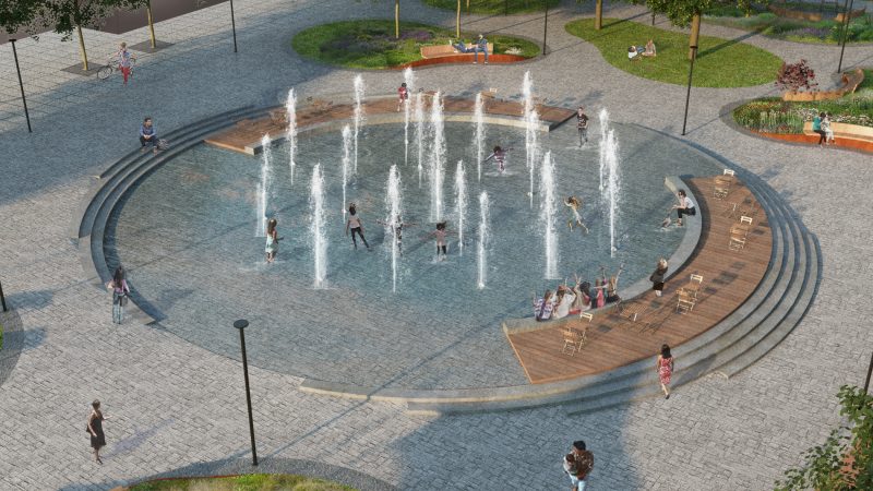 Rekonstrukcijos sulauks ir esamas fontanas. Neliks dabartinių jo duobių – vandens čiurkšlės į viršų šaus tiesiai iš aikštės grindinio. Pasak architektų, toks fontano sprendimas sukurs trauką į šią erdvę: čia galės žaisti vaikai, ant į fontaną integruotų terasų kavinės išnešti staliukus. Aikštės centrinėje dalyje dar numatyta nauja vaikų žaidimų aikštelė.