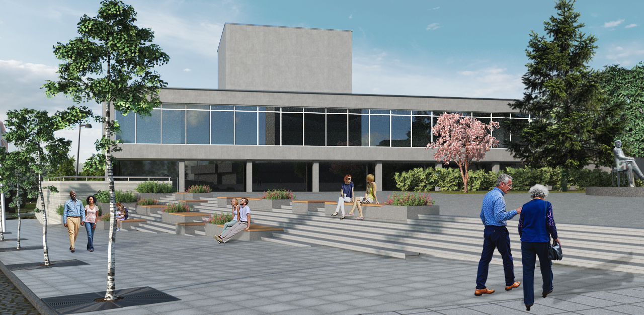 Keisis ir P. Plechavičiaus skvero vaizdas. Čia po esamomis pušimis ketinama įrengti jaunatvišką zoną su šiuolaikiško dizaino skulptūriškomis sėdėjimo vietomis – savotišką salelę studentams. Skvere esančios sienelės viršus irgi keičiamas – šioje vietoje taip pat planuojama įrengti suoliukus.