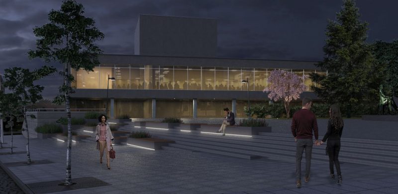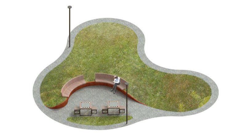 Keisis ir P. Plechavičiaus skvero vaizdas. Čia po esamomis pušimis ketinama įrengti jaunatvišką zoną su šiuolaikiško dizaino skulptūriškomis sėdėjimo vietomis – savotišką salelę studentams. Skvere esančios sienelės viršus irgi keičiamas – šioje vietoje taip pat planuojama įrengti suoliukus.