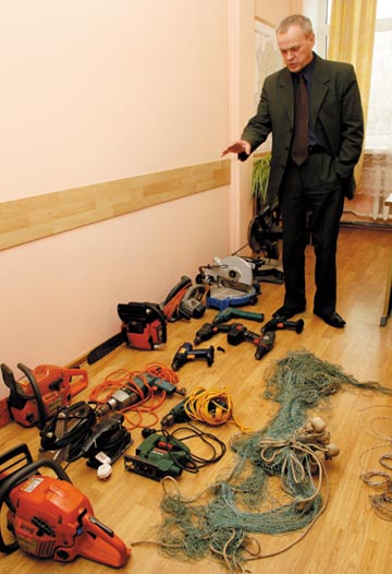 Dar daugiau daiktų buvo prikaupęs raguviškis L.P. Vyriškio namuose aptikta 15 įvairių įrankių: elektrinis šlifuoklis „Chalenge“, elektrinė obliavimo mašina „Execel“, elektrinis siaurapjūklis „Bosch“, du elektriniai grąžtai „Black & Decker“, penki akumuliatoriniai grąžtai „Promax“, „Black&Decker“ „Makita“ ir „Drill/Driver“, elektrinis diskinis pjūklas „Wickes“, dvejos kampinio pjovimo staklės „Helpine“ ir „Nutool“, benzininiai pjūklai „Husqvarna“ ir „Homelite“. Kam jie priklauso, policininkams reikės išsiaiškinti. „Visi šie įrankiai gali būti pavogti iš statybos objektų, – mano S.Petraitis. – Policijos pareigūnams teks nustatyti jų savininkus“. Rajono Policijos komisariatas prašo žmonių, atpažinusių savo daiktus, kreiptis į policijos viršininką S.Petraitį tel.: 503440, (8-687) 12089 arba į tyrėjus tel. 503428.