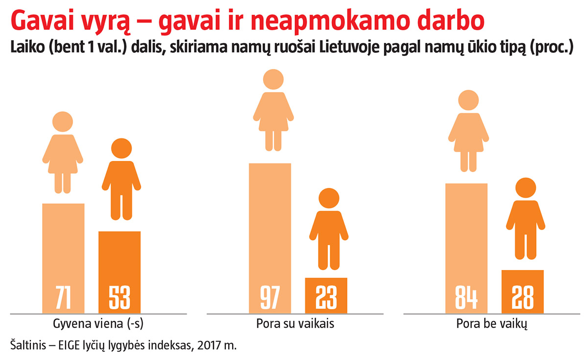 Iš tiesų su kiekvienu vaiku moterys vis dažniau atsisako darbo, arba jam tiesiog turi mažiau laiko. Pagal EIGE lyčių lygybės indeksą, laikas namų ruošai tarp vyrų ir moterų pradeda skirtis tada, kai sukuriamas šeimos ūkis, – tam bent valandą skiria 53 proc. viengungių vyrų, tačiau tarp gyvenančių su moterimi tokių telieka 28 proc., o porai susilaukus pirmagimio – vos 23 proc.