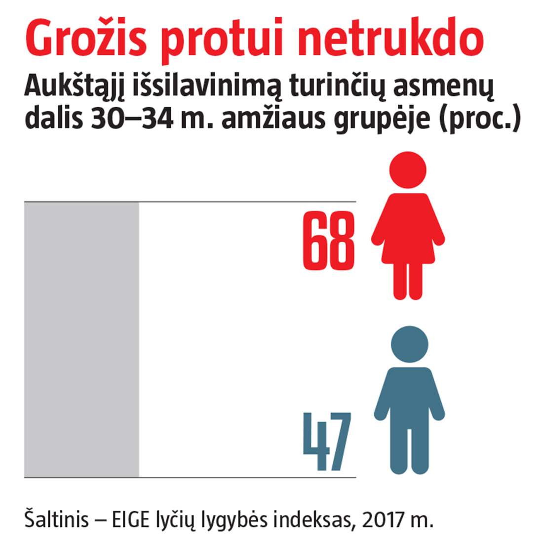 „Nors lietuvės bene labiausiai išsilavinusios Europoje, joms tai nesuteikia jokio pranašumo darbo rinkoje, – teigė specialistė. – Tai atsiliepia ne tik moterims, bet ir valstybei, kuri investavo į jų išsilavinimą.“ Tarp 30–34 m. amžiaus moterų yra penktadaliu daugiau įgijusių aukštąjį išsilavinimą nei vyrų, tačiau bendras atlyginimų atotrūkis beveik tokiu pačiu mastu svyra į priešingą pusę – nepriklausomai nuo darbo srities.