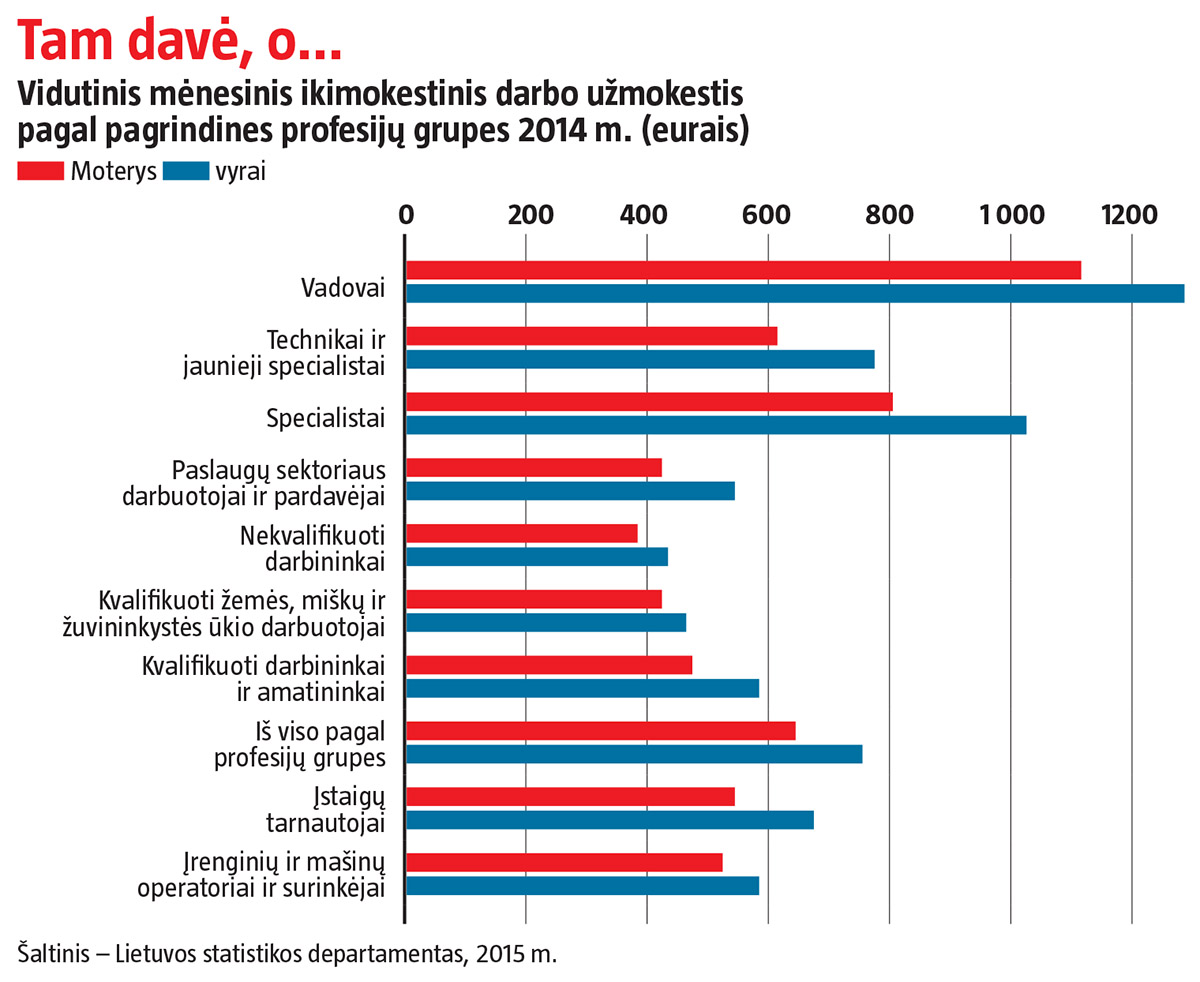 Be to, suskaičiuotos dirbančiųjų galvos – dar ne visaverčio įsitraukimo rodiklis. Moterys dažniau dirba ne visu krūviu, renkasi prasčiau apmokamas profesijas ir kur kas rečiau užima vadovų pozicijas.
