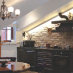 Virtuvė, spintos ir lentynos integruotos specialiai tam suformuotose sienų nišose. Suderintas fasadų stilius ir medžiagos bei spalviniai sprendimai harmoningai papildo vieni kitus. Jaukiai antresolei parinkti lengvesnių formų, modernesni baldai.
