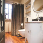 Kokybiško poilsio ir laisvalaikio vizijai įgyvendinti abiems zonoms skirti atskiri vonios ir dušo kambariai. Erdvėje po antresolės laiptais buvo įrengta ūkinė patalpa bei vyno „rūsys“ šeimininkui. Kadangi žmona itin mėgsta skaityti, šių patalpų siena puikiai pritiko knygų lentynai. Didžiulė sija bendroje erdvėje padalino svetainę į dvi– valgomojo ir poilsio prie židinio – zonas.
