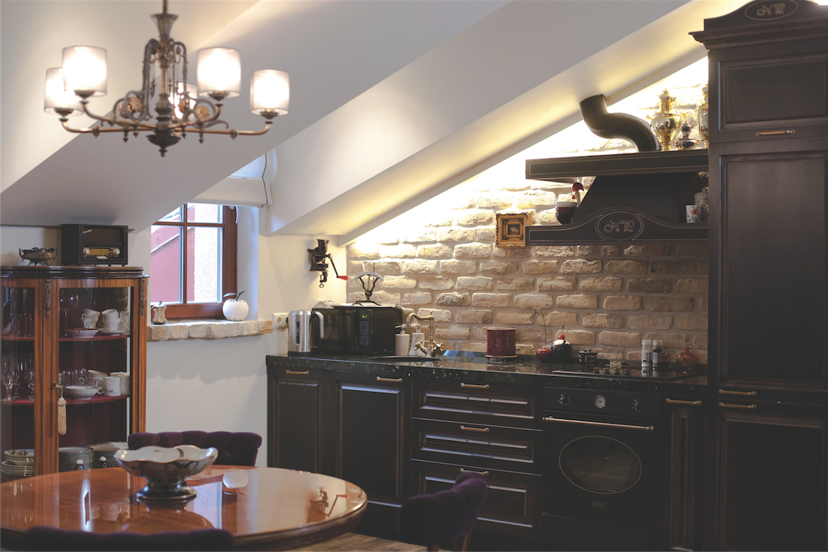 Virtuvė, spintos ir lentynos integruotos specialiai tam suformuotose sienų nišose. Suderintas fasadų stilius ir medžiagos bei spalviniai sprendimai harmoningai papildo vieni kitus. Jaukiai antresolei parinkti lengvesnių formų, modernesni baldai.