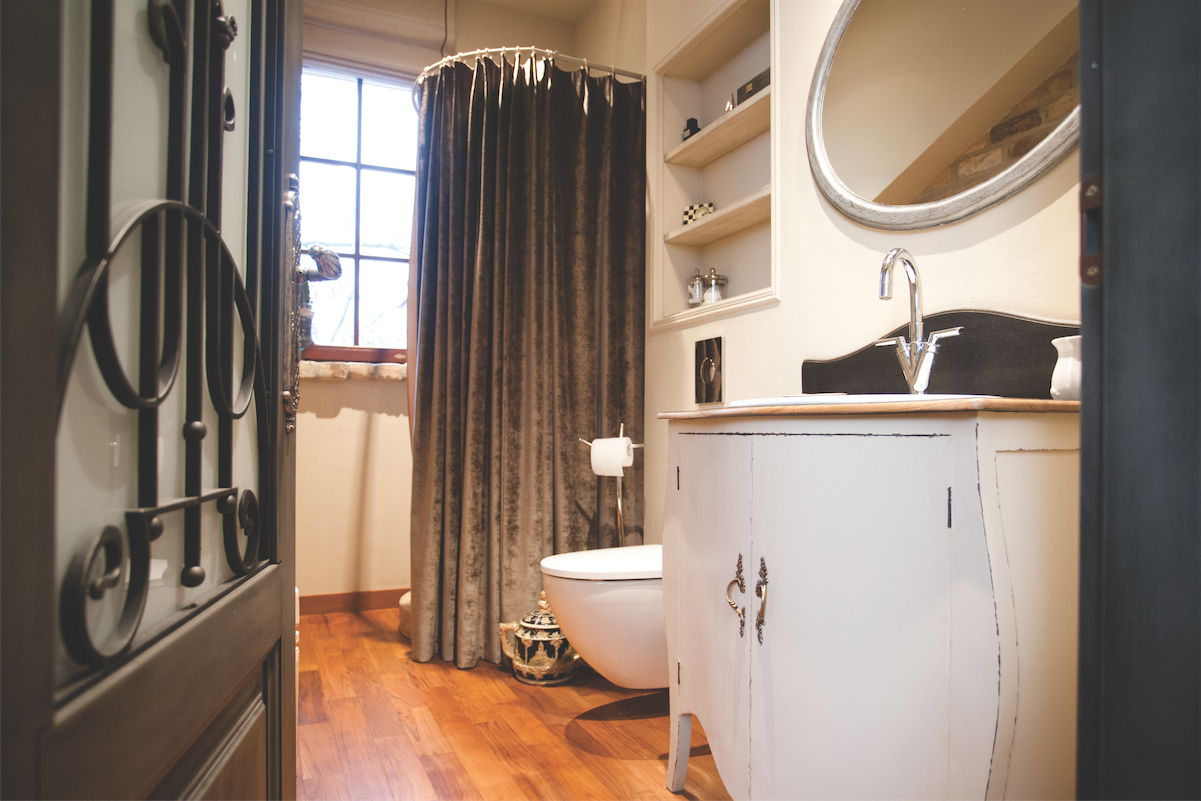 Kokybiško poilsio ir laisvalaikio vizijai įgyvendinti abiems zonoms skirti atskiri vonios ir dušo kambariai. Erdvėje po antresolės laiptais buvo įrengta ūkinė patalpa bei vyno „rūsys“ šeimininkui. Kadangi žmona itin mėgsta skaityti, šių patalpų siena puikiai pritiko knygų lentynai. Didžiulė sija bendroje erdvėje padalino svetainę į dvi– valgomojo ir poilsio prie židinio – zonas.