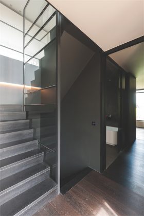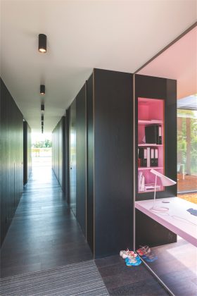 Juodai laminuotos faneros pertvarą pagyvina vertikalūs šviesų lentynėlių intarpai – tarsi užuomina į vertikalius namo elementus išorėje. Iš tos pačios plokštės išfrezuotos durelių rankenėlės subtiliai paįvairina pertvaros dizainą.