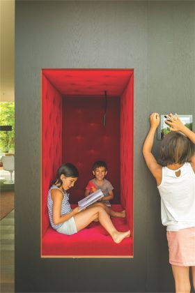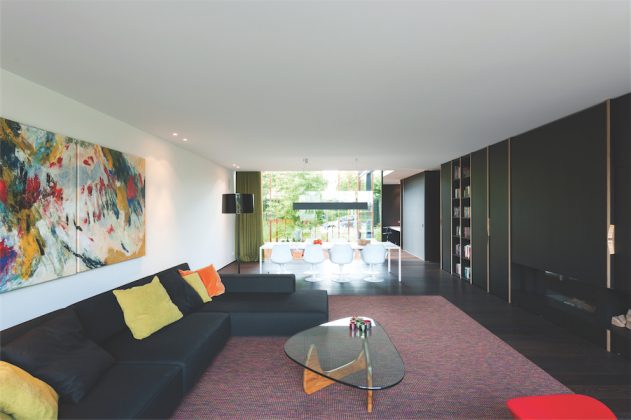 Pertvaros dydis įspūdingas: joje telpa daugelis integruotų spintų (iš koridoriaus pusės), o iš svetainės pusės – knygų lentynos, židinys bei niša malkoms pasidėti. Abu pertvaros galai taip pat funkcionalūs: čia įrengtos talpios nišos. Viena jų, dengta minkštu raudonu veliūru, – saugi „slėptuvė“ vaikams žaisti, priešingoje pusėje – spalvingas darbo vietai skirtas lentynėlių blokas.