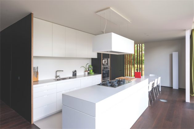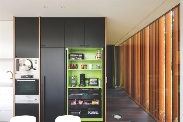 Virtuvės zona išsiskiria baltos spalvos švara ir lakoniškais baldais. Stalviršiais iš dirbtinio akmens „Corian“ bei kvarco „Silestone“ – ne tik estetiškas sprendimas, toks darbastalis atsparus karščiui, tvirtas bei ilgaamžis, ypač patogus naudoti. Netoli valgomojo stalo suprojektuotas juodai laminuotos faneros virtuvės spintų blokas tęsia tamsios spalvos motyvą, tačiau jų vidus – ryškiai žalios spalvos, atidarius dureles, gerai matyti viduje esantys daiktai. Spintų durys sukonstruotos neįprastai – atvertos jos integruojasi į vidinę spintos dalį, todėl netrukdo laisvai judėti valgomajame bei virtuvėje. Minimalistinio dizaino modernus gartraukis virš viryklės labiau primena spintelę, tarsi pranyksta erdvėje.