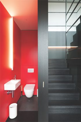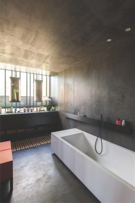 Vientisa spalvinė paletė išlaikyta ir erdviame vonios kambaryje šalia pagrindinio miegamojo. Ir čia architektai nepabūgo tamsių spalvų, kuriomis sienos tapybiškais potėpiais dekoruotos vandeniui atsparia cemento su specialiais rišikliais danga. Jų fone puikiai išryškėja aptakių formų balta vonia. Jokių nereikalingų daiktų – būtinus švarinimosi reikmenis talpina tik spintelė po praustuve ir sienos nišoje. Negilios praustuvės bei maišytuvai ypač šiuolaikiški. Išilgai vonios esančioje lentynėlėje galima sudėti prausimosi reikmenis. Veidrodžiai įrengti kiek neįprastoje vietoje – nuleisti ties langu virš praustuvių. Tamsioje patalpoje netikėtai suskamba keli ryškiaspalviai akcentai – kilimėliai, geltonos kabyklėlės bei raudoni suoleliai higienos kambaryje sukūrė subtilius ir jaukius spalvinius derinius.
