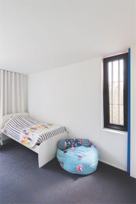 Vaikų kambariuose vyrauja balta spalva, kurią pagyvina ryškūs mėlyni bei raudoni interjero elementai. Abiejose patalpose – įdomūs kai kurių langų uždangų sprendimai: čia užuolaidų atsisakyta, o vietoj jų sumontuotos užtraukiamos slankiosios sistemos. Sieninių spintų rankenėlės suderintos su slankiųjų sistemų spalva. Grindys vaikų kambariuose išklotos praktiška belgų PVC danga, imituojančia tekstilę.