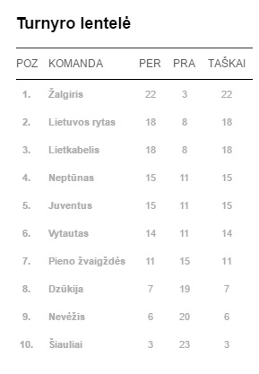 Šeštadienį aštuonioliktąją pergalę čempionate iškovojo Vilniaus „Lietuvos ryto“ ekipa. Rimo Kurtinaičio auklėtiniai namuose 76:72 (13:19, 26:22, 15:14, 22:17) įveikė pagirtinai gerai kovojusią Alytaus „Dzūkijos“ komandą, kuriai tai buvo jau devynioliktoji nesėkmė sezone.
