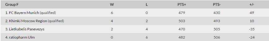 F grupėje Panevėžio krepšininkai vieninteles dvi pergales iškovojo būtent prieš „Ratiopharm“. Į kitą etapą žengusioms „Chimki“ ir „Bayern“ ekipoms buvo nusileista tiek namuose, tiek išvykoje.