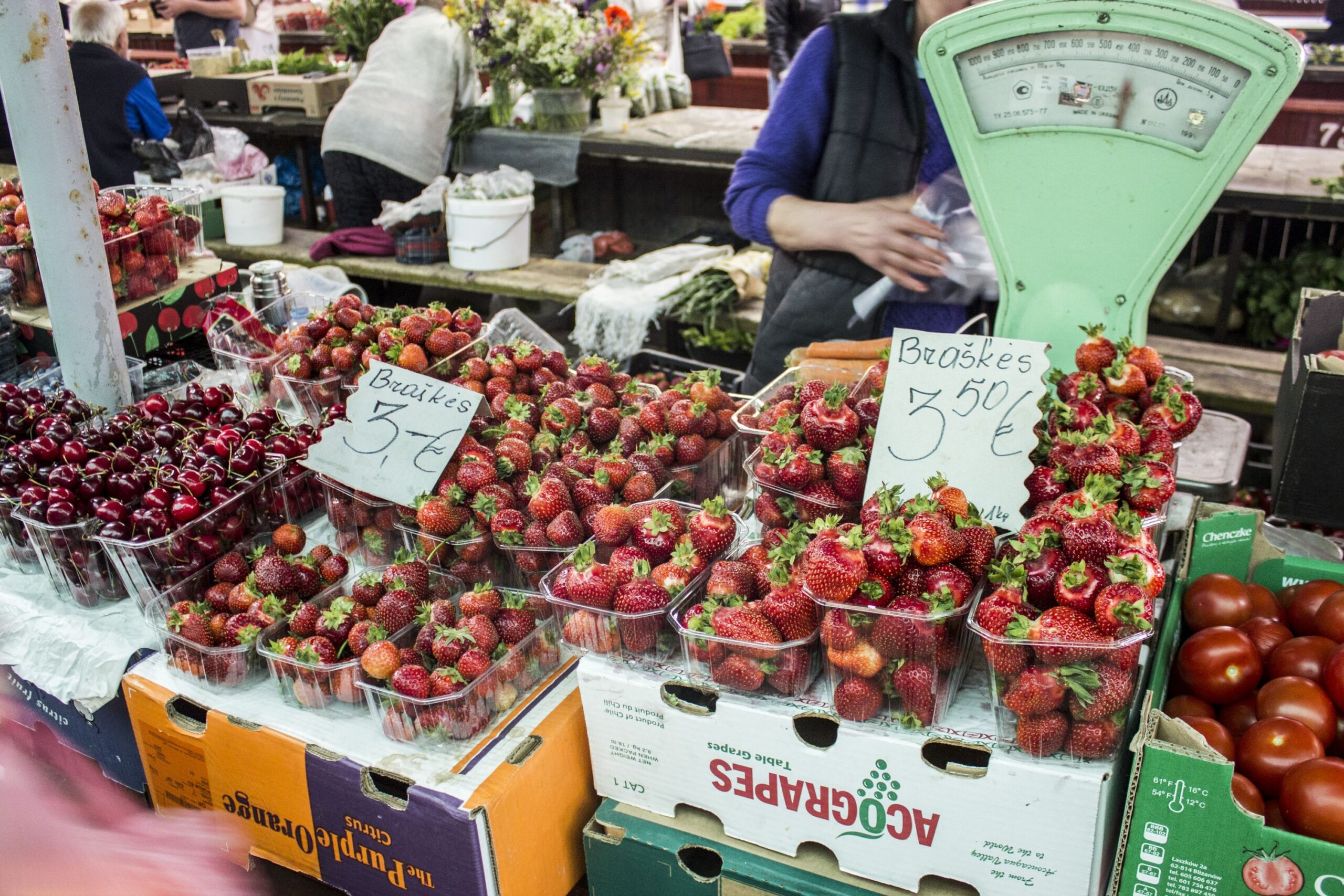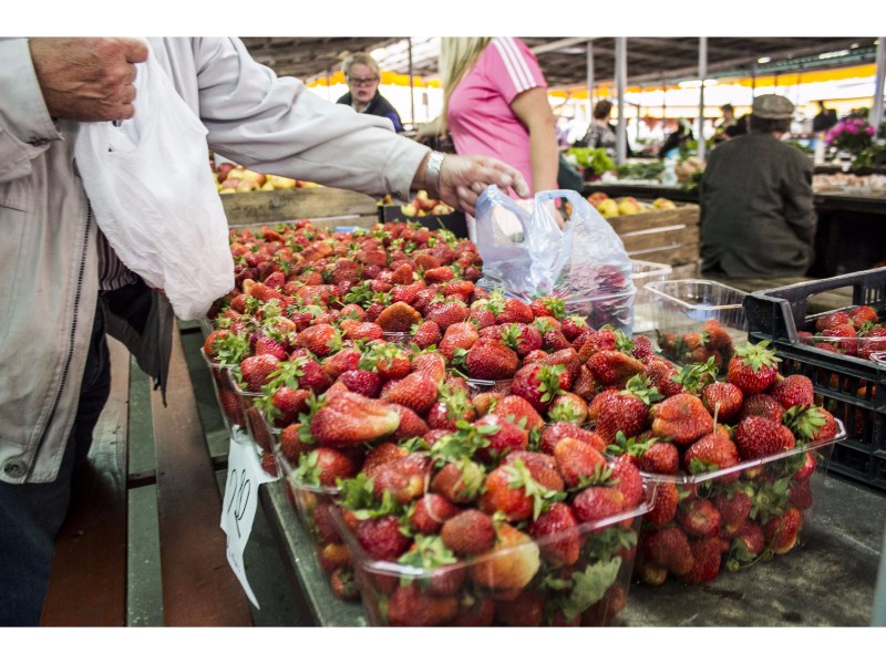 Turguje nuo spalvų net raibsta akys, bet akivaizdu, kad kol kas karaliauja braškės. Prekystaliai lūžta nuo uogų gausos. Galima rasti ir ką tik skintų lietuviškų, ir atvežtinių lenkiškų braškių. Tiesa, jų kaina skiriasi per pusę. Lenkiškų braškių kainos svyruoja nuo dviejų iki trijų su puse euro už kilogramą, o lietuviškų kai kur siekia ir septynis eurus.