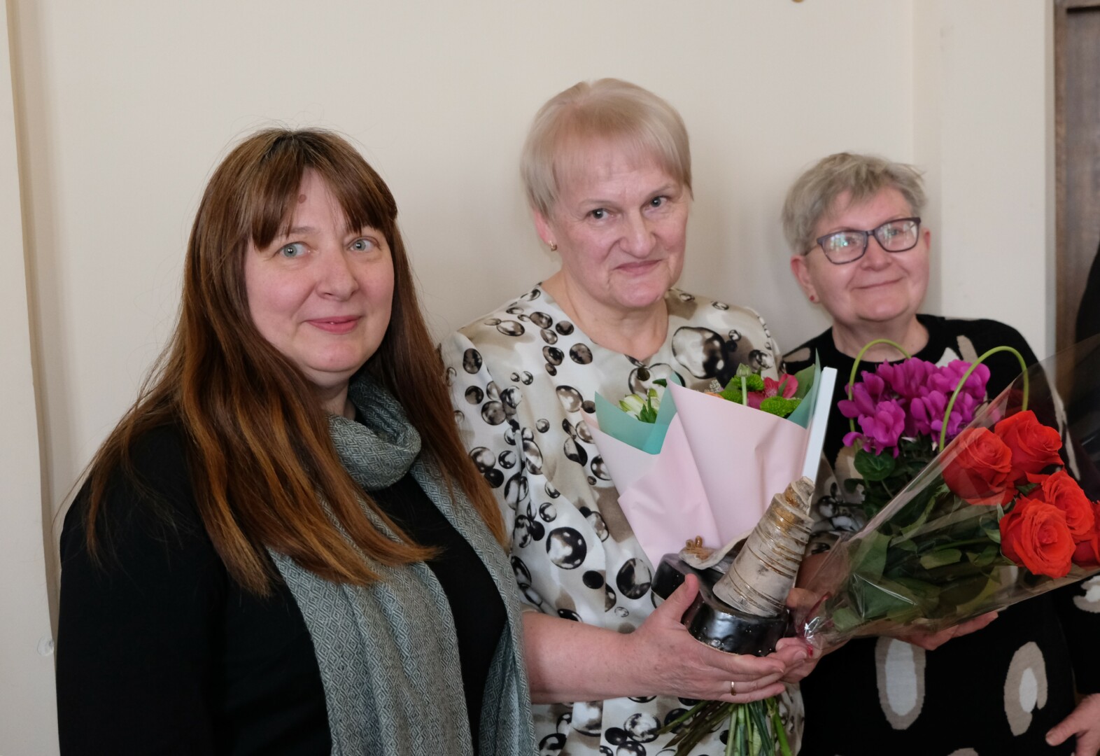 Valstybinės lietuvių kalbos komisijos ir Lietuvos mokslų akademijos organizuotame Lietuvių kalbos dienų renginyje L. Lapinskienei (viduryje) įteiktas laureatės diplomas ir autorinė Roko Dovydėno skulptūrėlė „Sraigė“. Aurelijos Baniulaitienės nuotr.
