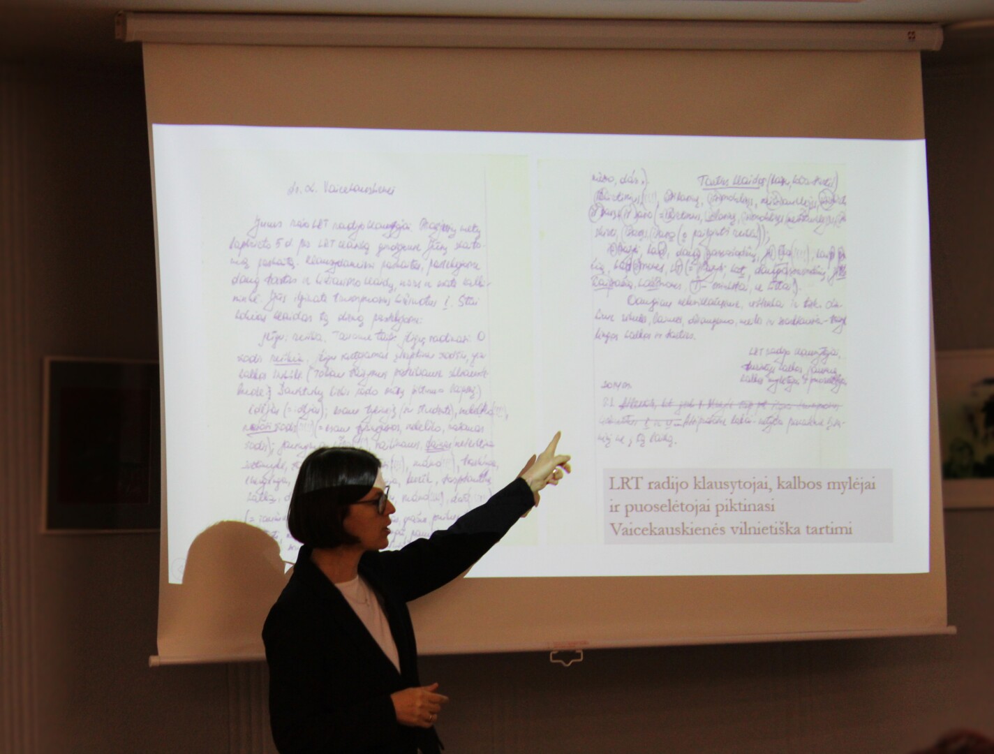 Auditoriją sudomino garso įrašas, kuriame keturi žmonės atsakė į klausimą „kas yra geras mokytojas?“ – kiekvienas kalbėjo savaip, skirtingais kalbėjimo būdais. Iš klausos buvo galima atpažinti tiek Panevėžio šnektos, tiek bendrinės (Vilniaus) tarmės ypatybes. Pasak profesorės, šis pavyzdys padeda suprasti, kas lemia kalbos vertę ir kokie kalbėjimo būdai visuomenei atrodo „priimtinesni“ ar „teisingesni“.