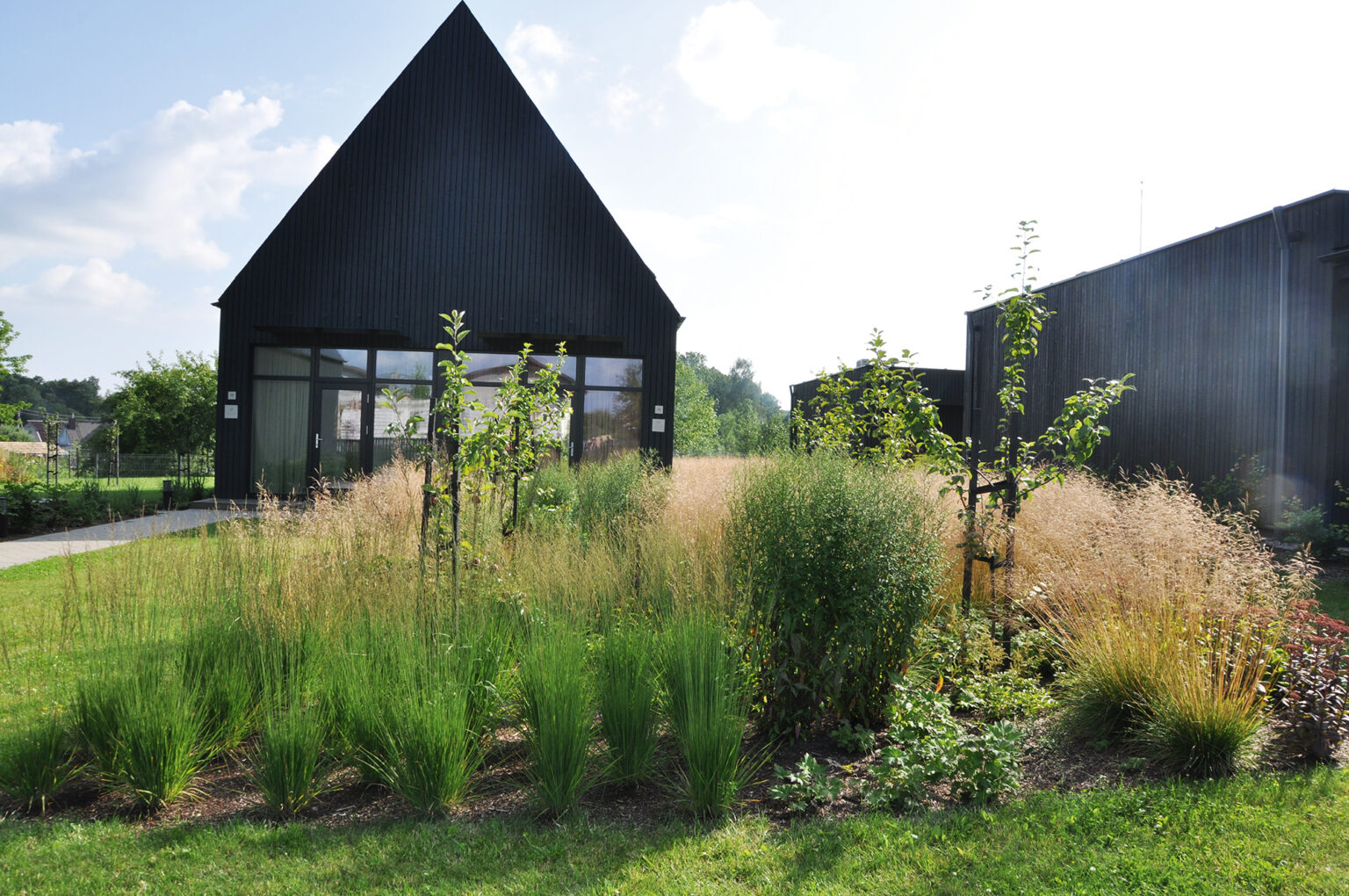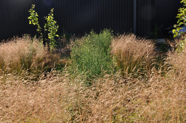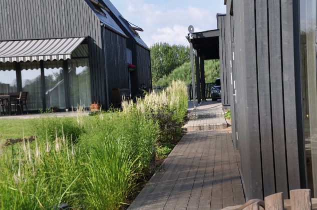 Dar prieš imdamasi poilsio namų aplinkos kūrimo darbų, architektė žinojo, kad didelę jos dalį sudarys žoliniai augalai: ,,Pagrindinis vaidmuo atitenka smilgoms, arba dekoratyvinėms žolėms, o štai šermukšniai atlieka labiau ,,darbinę“ funkciją – jie uždengia tam tikras vietas, kad jos būtų nematomos iš gatvės, suteikia visumai reikiamą struktūrą.“ Renkantis žydinčius augalus, siekta kontrasto su juodu poilsio namų fasadu. Atsižvelgiant į tai, aplinkoje sužydėjo balti, gelsvi, šviesiai rausvi, kreminės spalvos augalai.