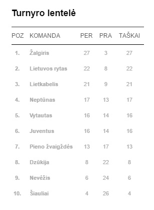 Šešioliktąją pergalę iškovojo Prienų–Birštono „Vytauto“ krepšininkai. Virginijaus Šeškaus auklėtiniai namuose 95:87 (22:15, 27:24, 26:26, 20:22) įveikė turnyro lentelės šeimininkę, Utenos „Juventus“ ekipą, kuriai tai buvo jau keturioliktoji nesėkmė.