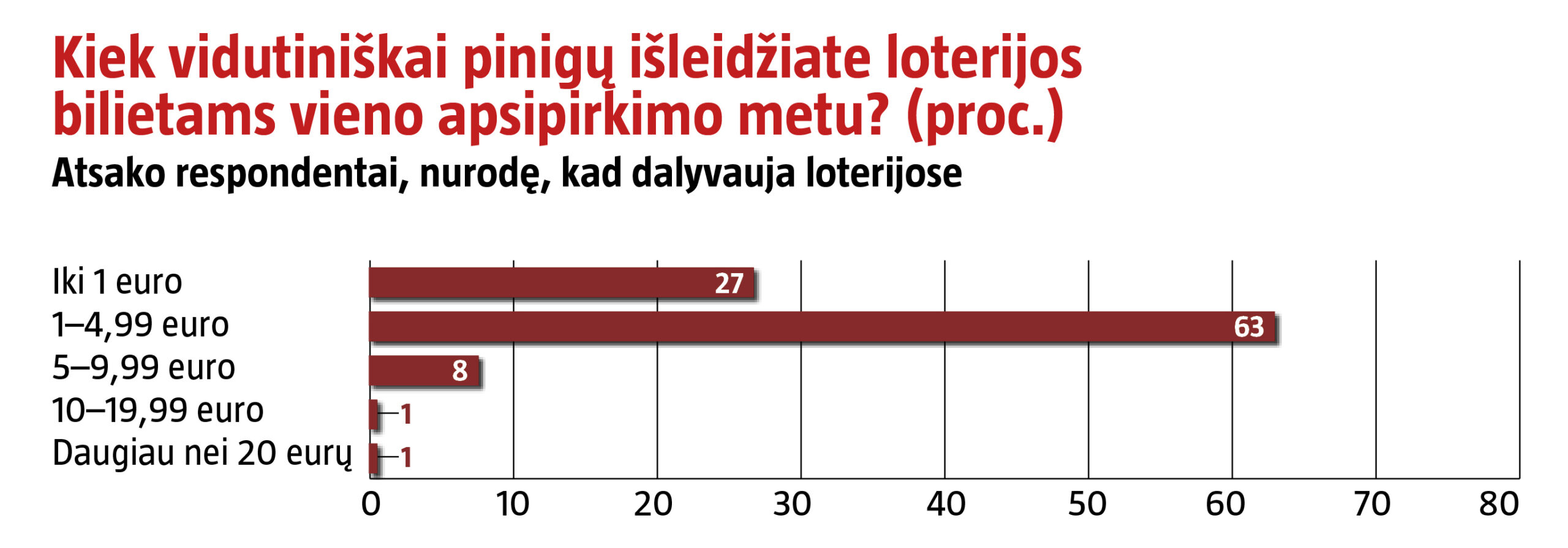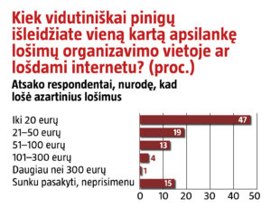 Vieną kartą apsilankę lošimų organizavimo vietoje ar lošdami internetu, 47 proc. respondentų, lošiančių azartinius lošimus, išleidžia iki 20 eurų, 19 proc. – nuo 21 iki 50 eurų. Loterijos bilietams dauguma šalies gyventojų (63 proc.) nepagaili nuo 1 iki 4,99 euro.