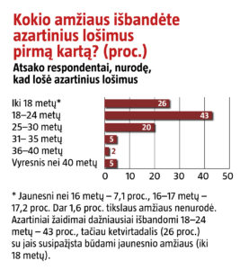 Daugiausia (43 proc.) iš lošusių azartinius lošimus Lietuvos gyventojų pirmą kartą šią veiklą išbandė būdami 18–24 metų. Net 26 proc. tai darė dar nesulaukę pilnametystės: jaunesni nei 16 metų – 7,1 proc., 16–17 metų – 17,2 proc.
