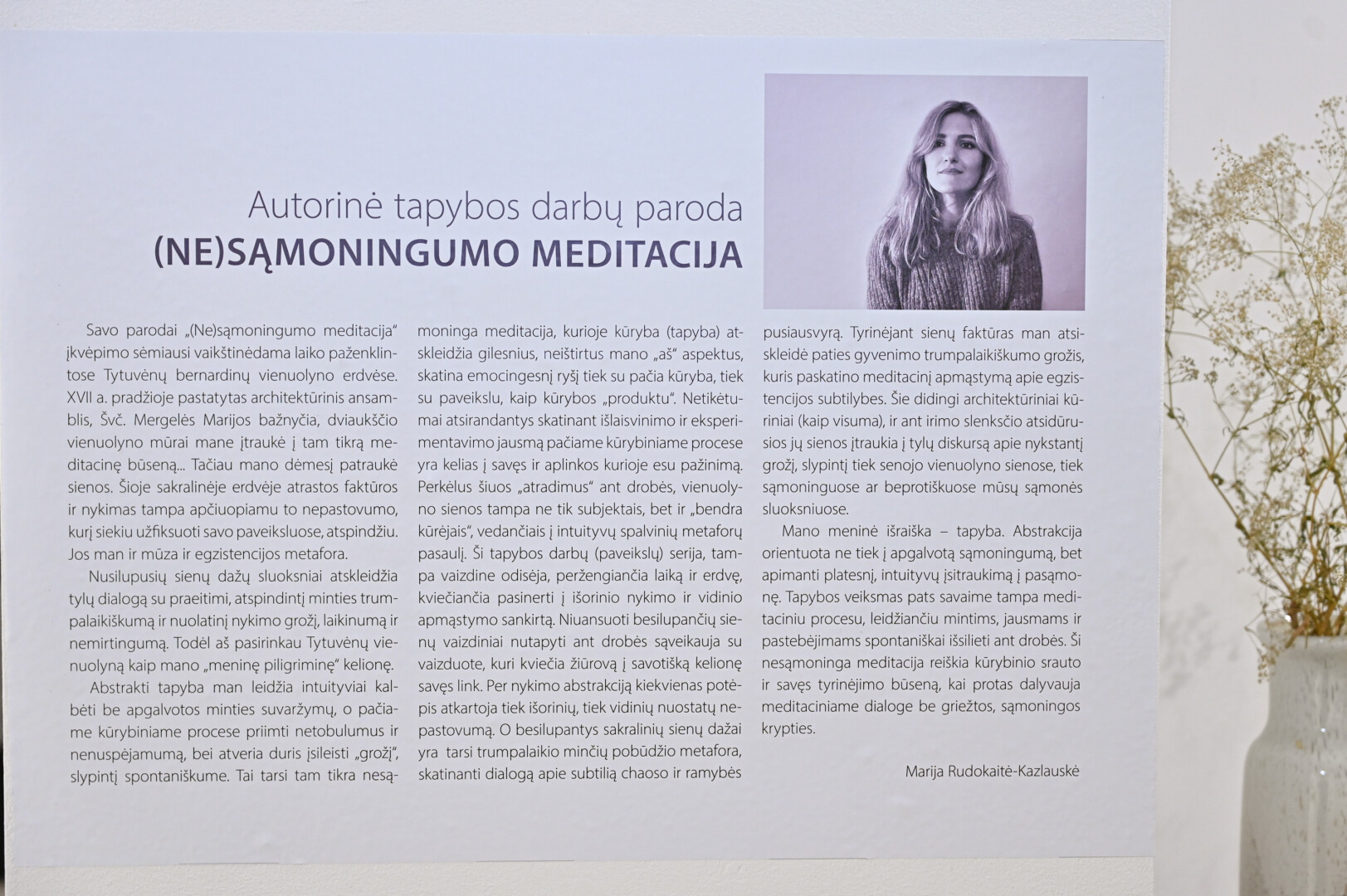 Jau kelis šimtus metų Tytuvėnus garsinantis vienas žymiausių Lietuvoje baroko paminklų – bernardinų vienuolynas panevėžietę tapytoją Mariją Rudokaitę-Kazlauskę įtraukė į meditacinę būseną, iš kurios gimė abstrakčios tapybos paveikslai.