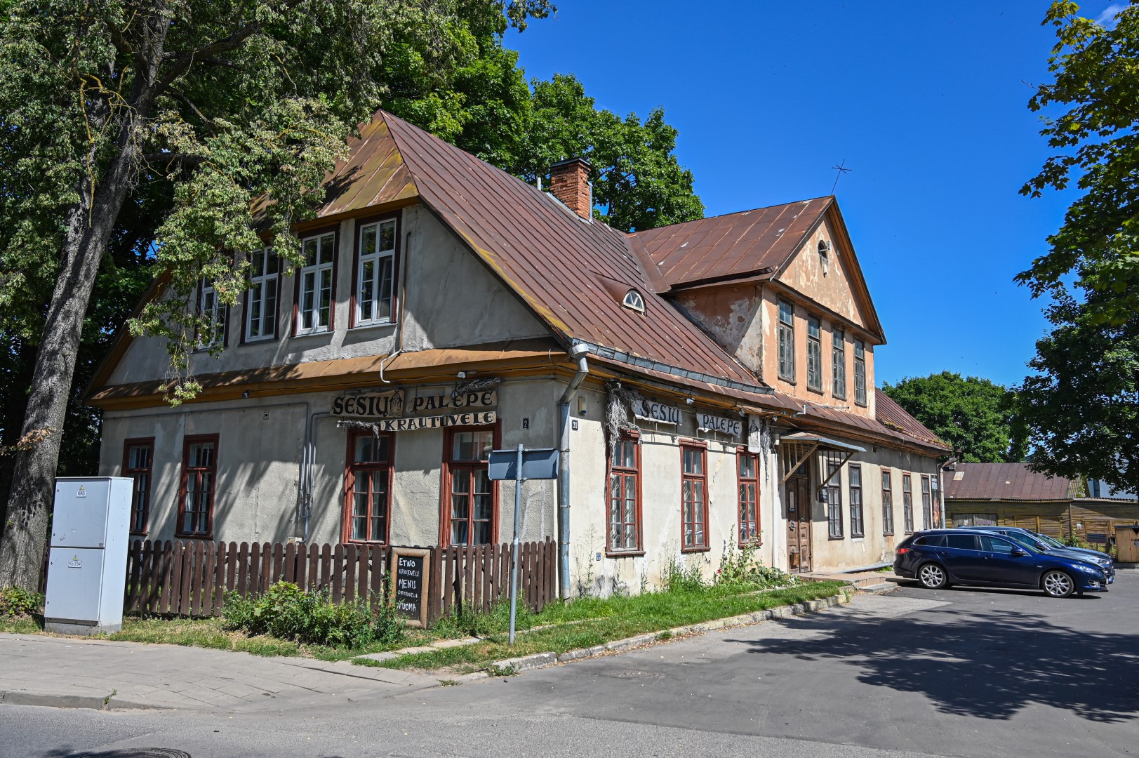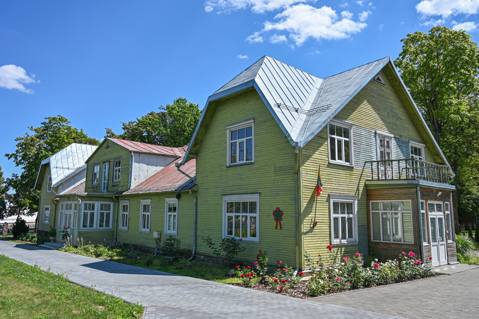 Pastatas didelis, su mansarda, balkonu, dekoruotas raižiniais.