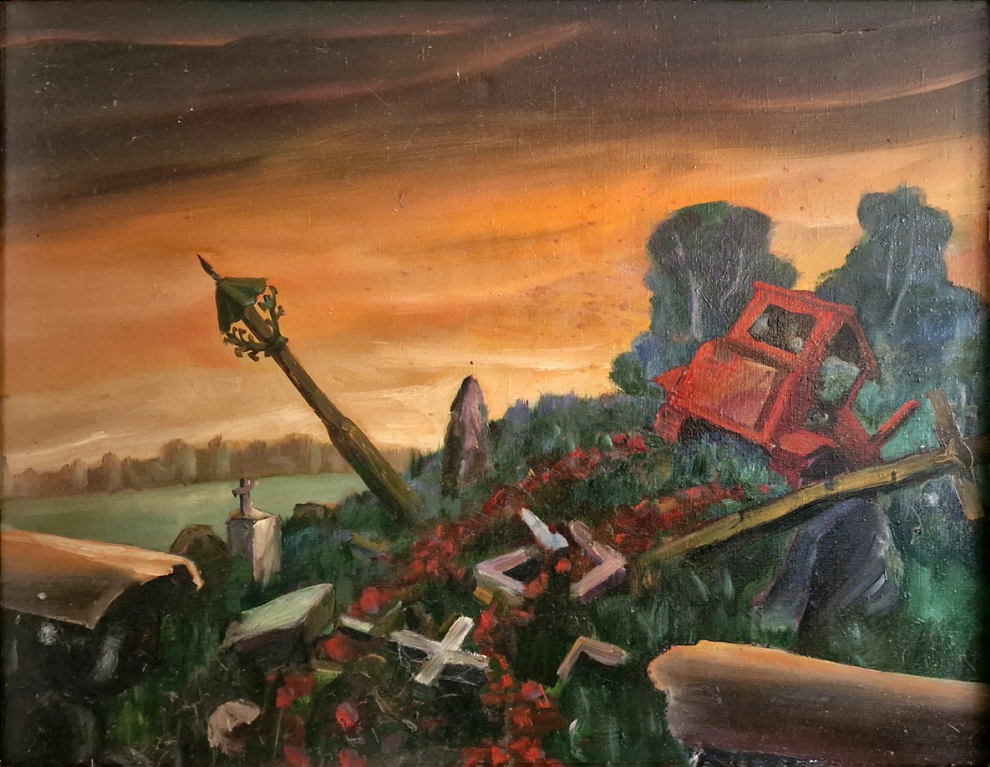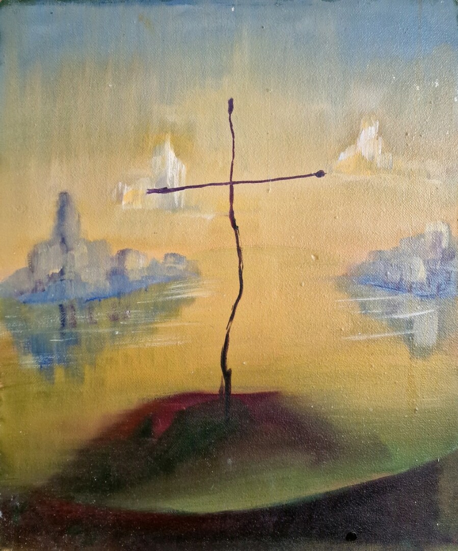 Viename Atgimimo laikų paveiksle vaizduojamas ant kalno stovintis pasviręs kryžius ir nuo uolos tarsi krentantis medis. Užrašuose tapytojas ant kalno stovinčio kryžiaus simbolį įvardija trumpai – tikėjimas. Taip pavadintas ir pats paveikslas.