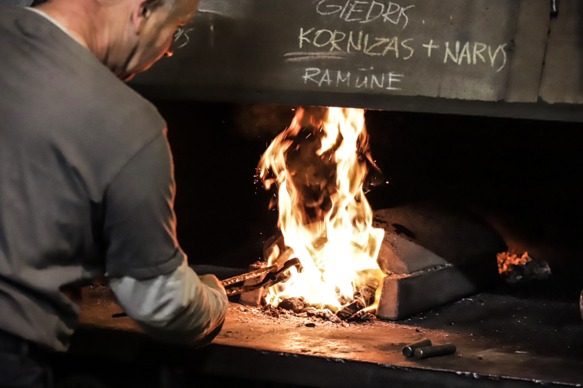 Užkuriamas platus žaizdras, plevena skaisti liepsna, šalia jos du priekalai, du plaktukai – Vigintos kilnojamas nė kiek ne lengvesnis.