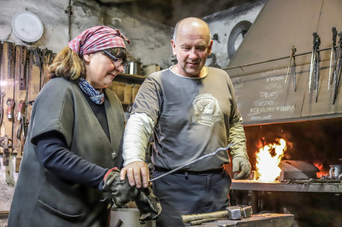 Tautodailininkai Rolandas ir Viginta Jakuboniai Šilagalyje esančioje savo kalvėje žaizdrą užkuria kiekvieną darbo dieną.