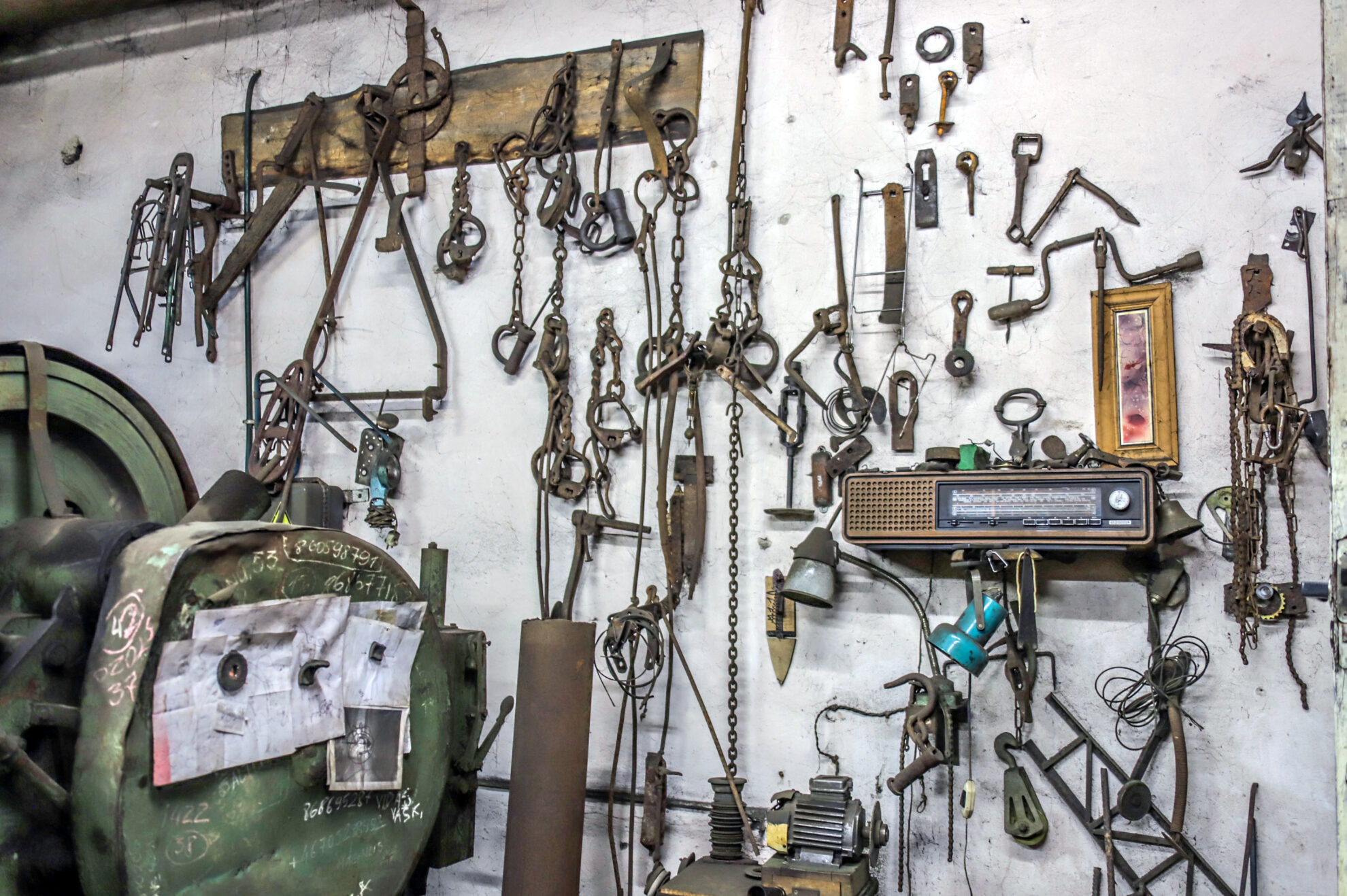 Kalvis traukia iš spintelės pusę seno ratlankio, gabaliuką nežinia kokiame šiukšlyne rasto, rūdimis apaugusio metalo gabalėlį.