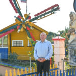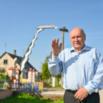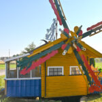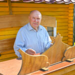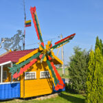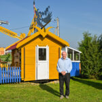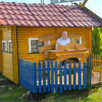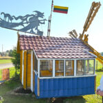 „Tai trobelė ant vištos kojelės. Pastačiau ją tokią, kad įėjus pastatas suktųsi aplinkui savo ašį. Iš tiesų tai svečių namas. Jo viduje – alaus baras, vyno rūsys, tad svečiams galvelės gali susisukti kaip reikiant. Bet kad svečiai nebelabai lankosi. Alaus bačka jau metai kaip nepraimta“, – juokiasi išskirtinio kiemo šeimininkas 74-erių Romas Jutelis.