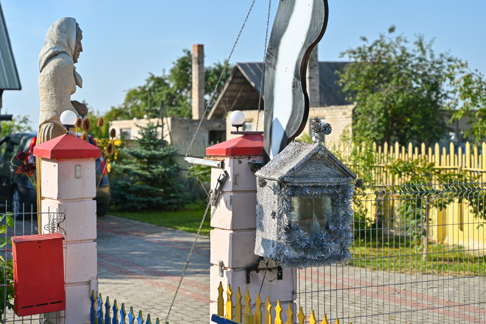 O štai prie kiemo vartų naujamiestietis pasistatė koplytėlę, joje – šventųjų ir angelų statulėlės. Šeimininkas pastebėjo ne vieną pro šalį einančią moteriškę stabtelint prie koplytėlės ir net žegnojantis.