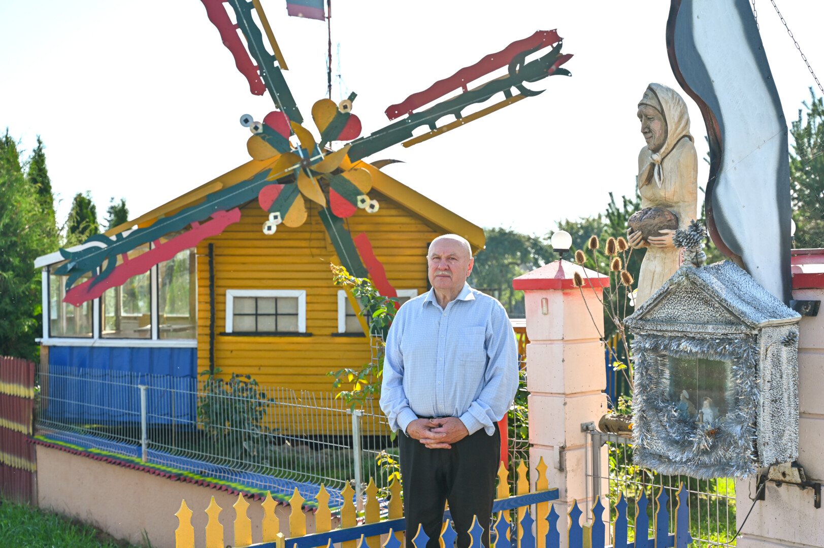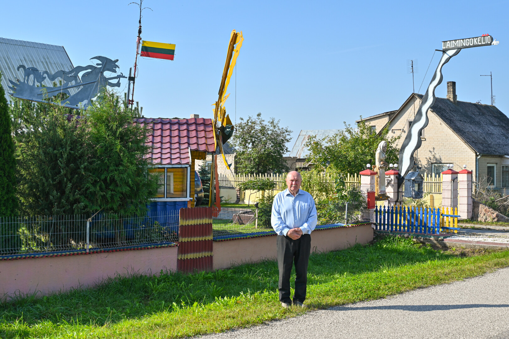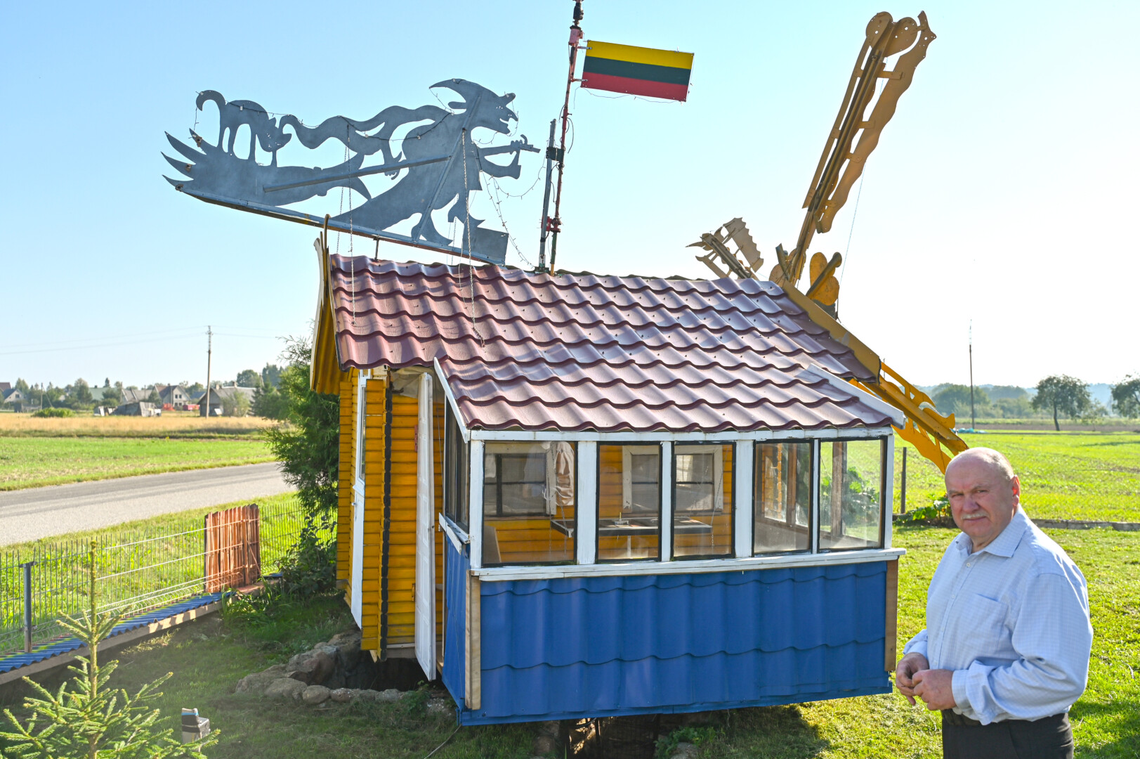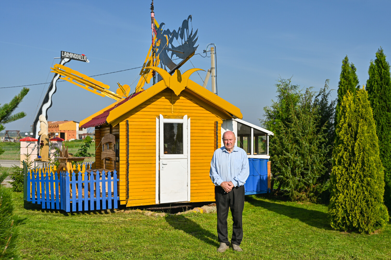 „Tai trobelė ant vištos kojelės. Pastačiau ją tokią, kad įėjus pastatas suktųsi aplinkui savo ašį. Iš tiesų tai svečių namas. Jo viduje – alaus baras, vyno rūsys, tad svečiams galvelės gali susisukti kaip reikiant. Bet kad svečiai nebelabai lankosi. Alaus bačka jau metai kaip nepraimta“, – juokiasi išskirtinio kiemo šeimininkas 74-erių Romas Jutelis.
