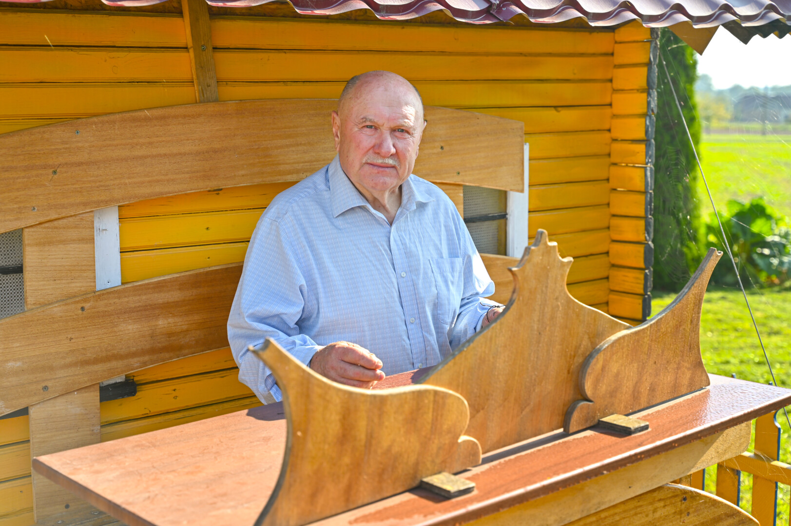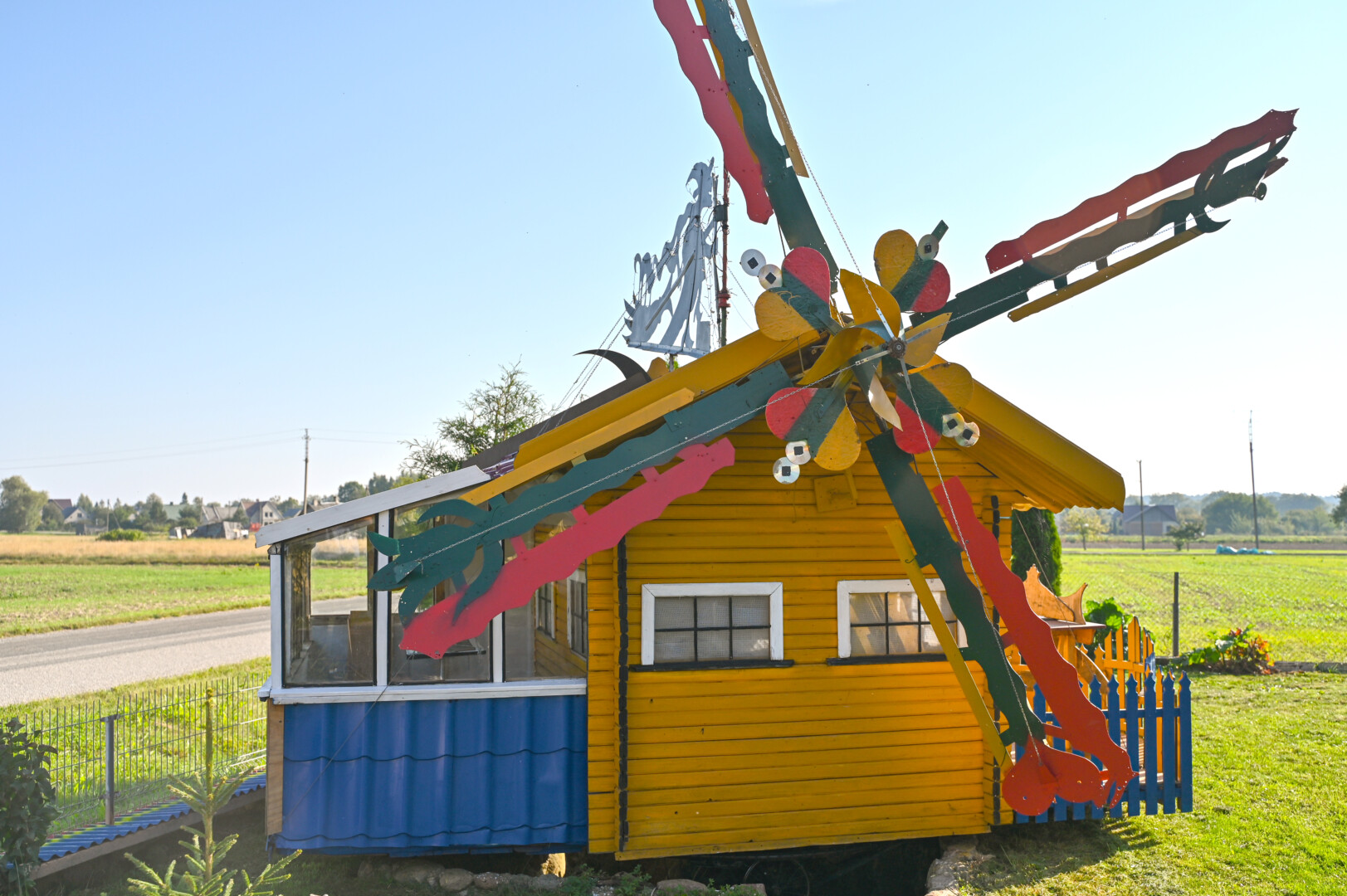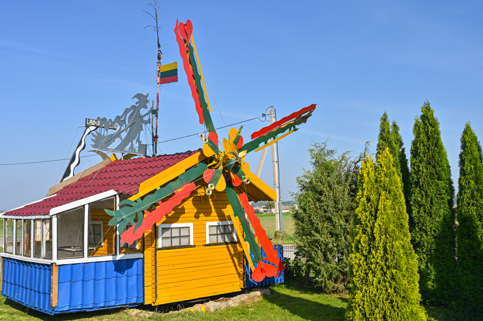 „Tai trobelė ant vištos kojelės. Pastačiau ją tokią, kad įėjus pastatas suktųsi aplinkui savo ašį. Iš tiesų tai svečių namas. Jo viduje – alaus baras, vyno rūsys, tad svečiams galvelės gali susisukti kaip reikiant. Bet kad svečiai nebelabai lankosi. Alaus bačka jau metai kaip nepraimta“, – juokiasi išskirtinio kiemo šeimininkas 74-erių Romas Jutelis.