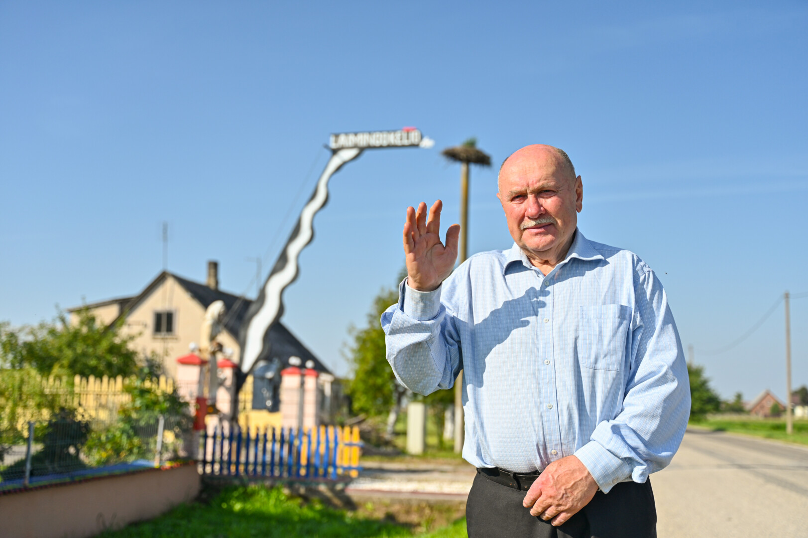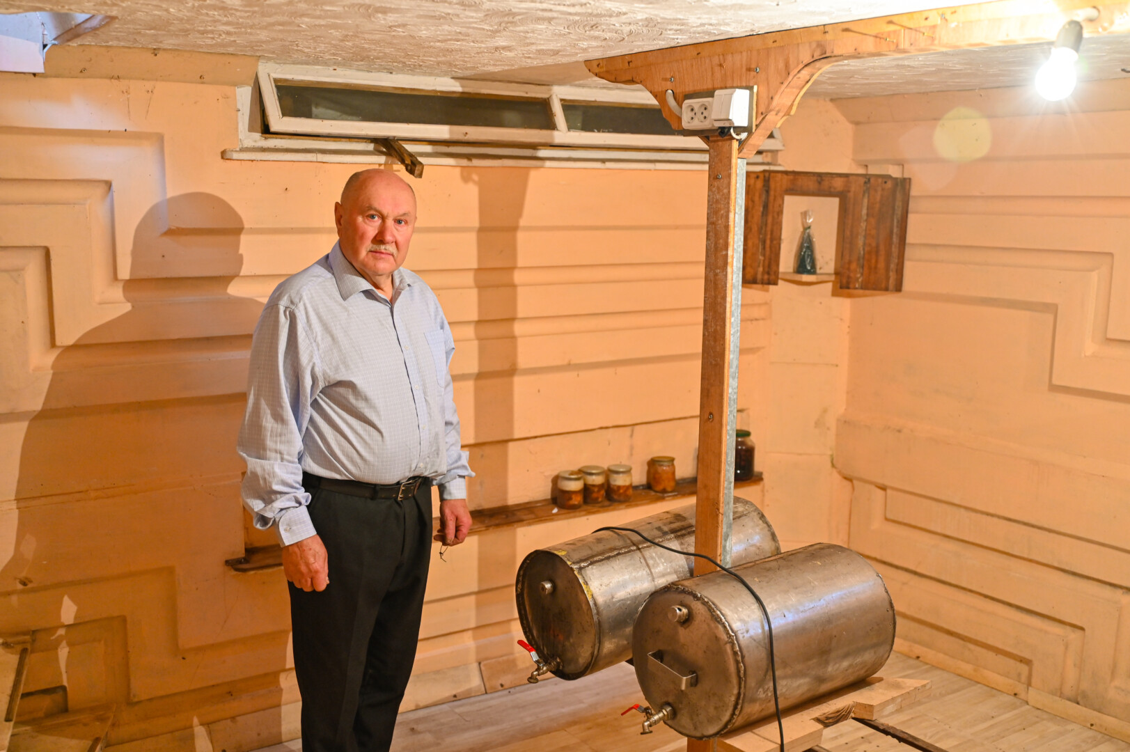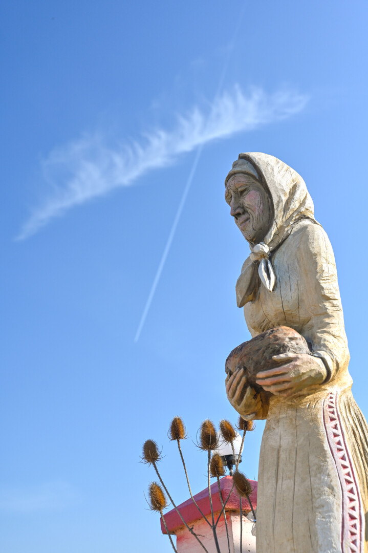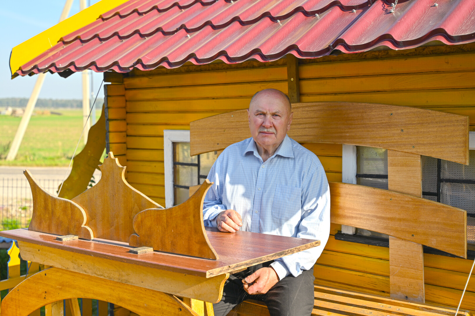 „Tai trobelė ant vištos kojelės. Pastačiau ją tokią, kad įėjus pastatas suktųsi aplinkui savo ašį. Iš tiesų tai svečių namas. Jo viduje – alaus baras, vyno rūsys, tad svečiams galvelės gali susisukti kaip reikiant. Bet kad svečiai nebelabai lankosi. Alaus bačka jau metai kaip nepraimta“, – juokiasi išskirtinio kiemo šeimininkas 74-erių Romas Jutelis.
