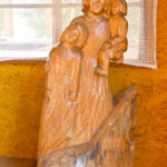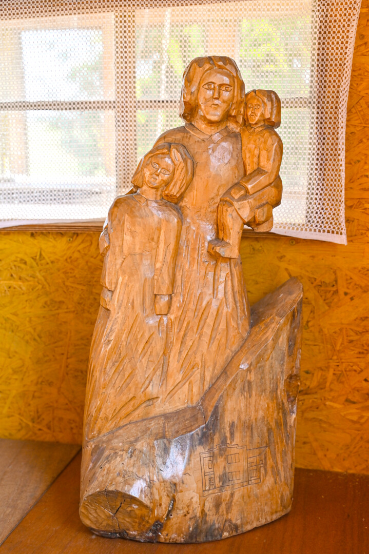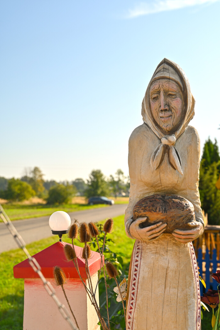 Sodybos vartuose jis įmontavo kone žmogaus dydžio medžio skulptūrą – senolę su duonos kepalu. Pasak Romo, kai buvo jaunesnis, verslo reikalais yra tekę išvažinėti nemažai Rusijos, o ten tekdavę sutikti panašių širdingų bobulių. Ne viena yra jį, pakeleivį, palaiminusi.