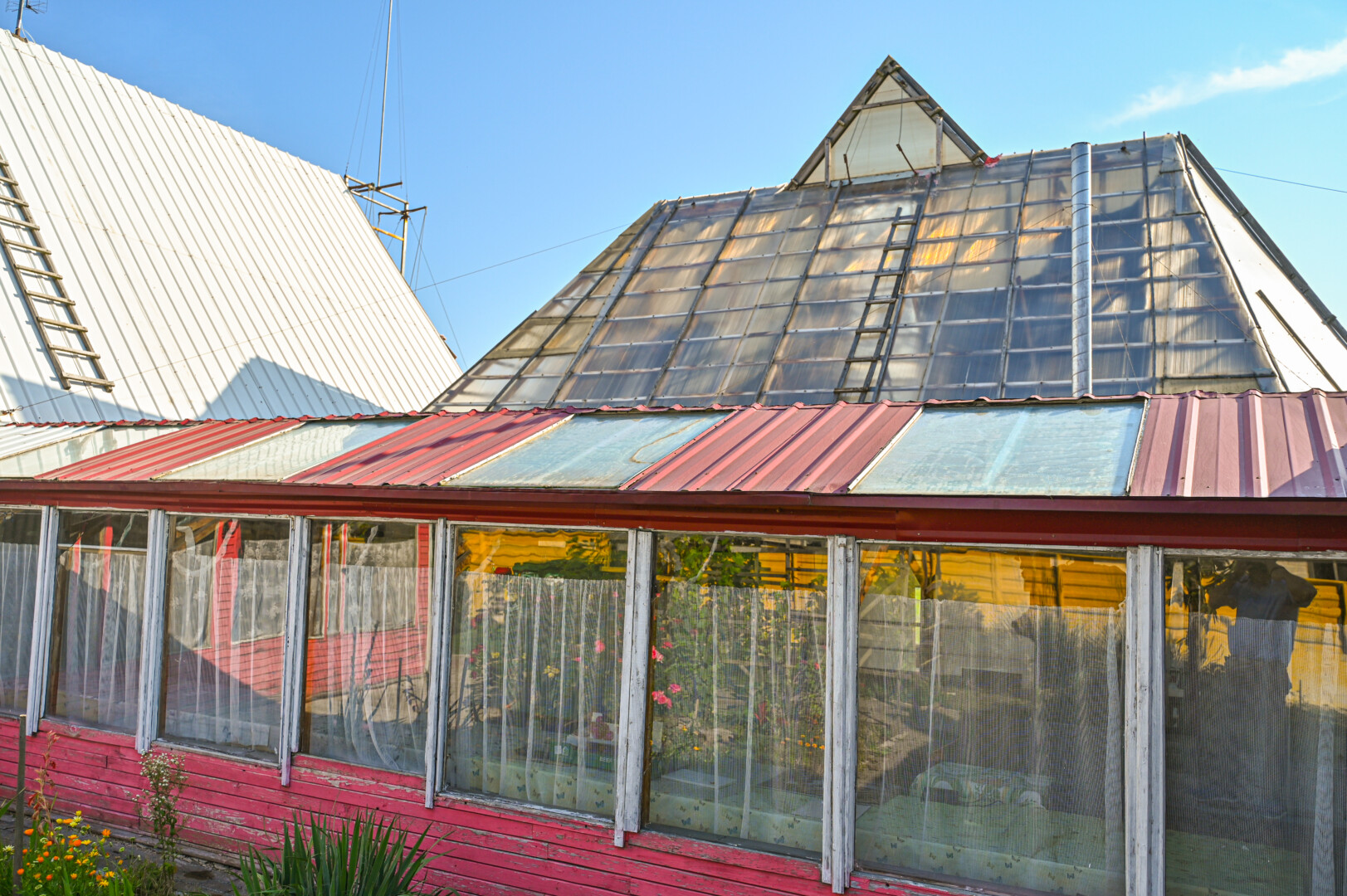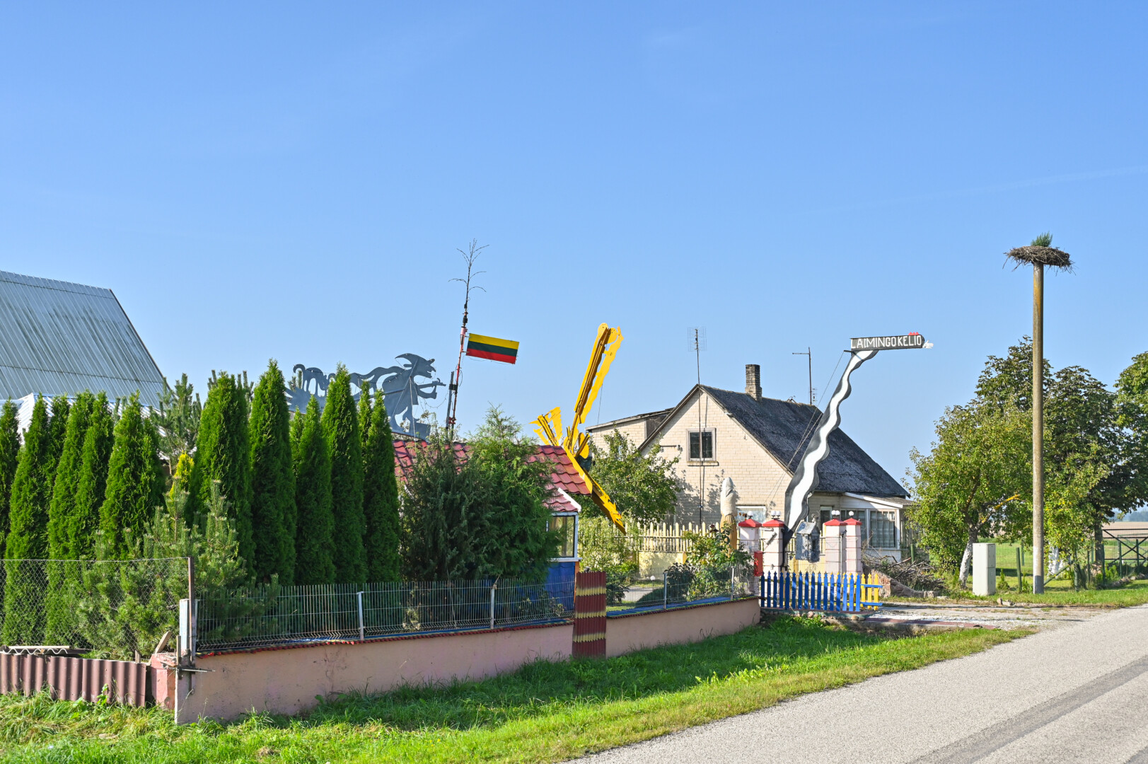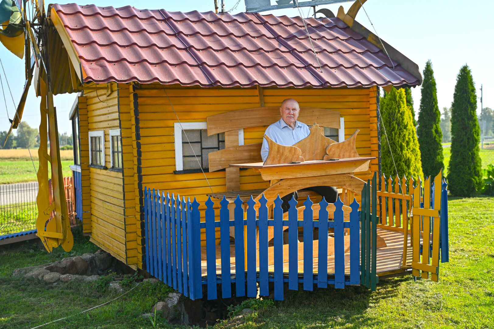 „Tai trobelė ant vištos kojelės. Pastačiau ją tokią, kad įėjus pastatas suktųsi aplinkui savo ašį. Iš tiesų tai svečių namas. Jo viduje – alaus baras, vyno rūsys, tad svečiams galvelės gali susisukti kaip reikiant. Bet kad svečiai nebelabai lankosi. Alaus bačka jau metai kaip nepraimta“, – juokiasi išskirtinio kiemo šeimininkas 74-erių Romas Jutelis.