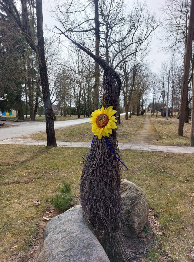 Kompoziciją papildė Ukrainą palaikyti gamintos gėlės.