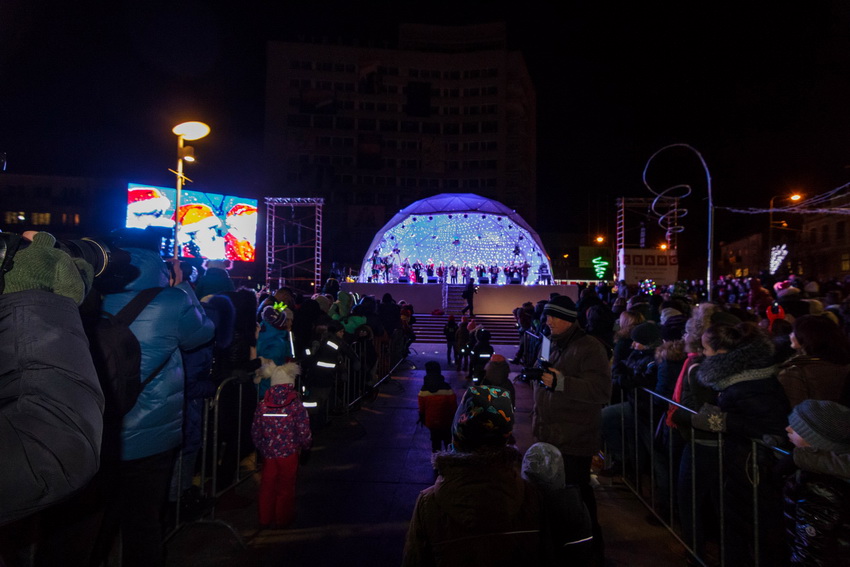 Susirinkusieji aikštėje nuo šalčio gynėsi smagiomis kalėdinėmis dainomis, kurias scenoje atliko solistai Laima Česlauskaitė, Vaidas Dzežulskis, kiti. Tačiau nekantriai laukiantys svarbiausios šventinės puošmenos – eglės – įžiebimo miestiečiai vis dairėsi tai į skarotąją. Kol įvyko didžiausia šventės staigmena: nuo viešbučio stogo, tarsi iš paties dangaus, nusileidęs Kalėdų Senelis atgabeno stebuklingą žvaigždę ir jos spinduliais įžiebė Panevėžio Kalėdų eglę.
