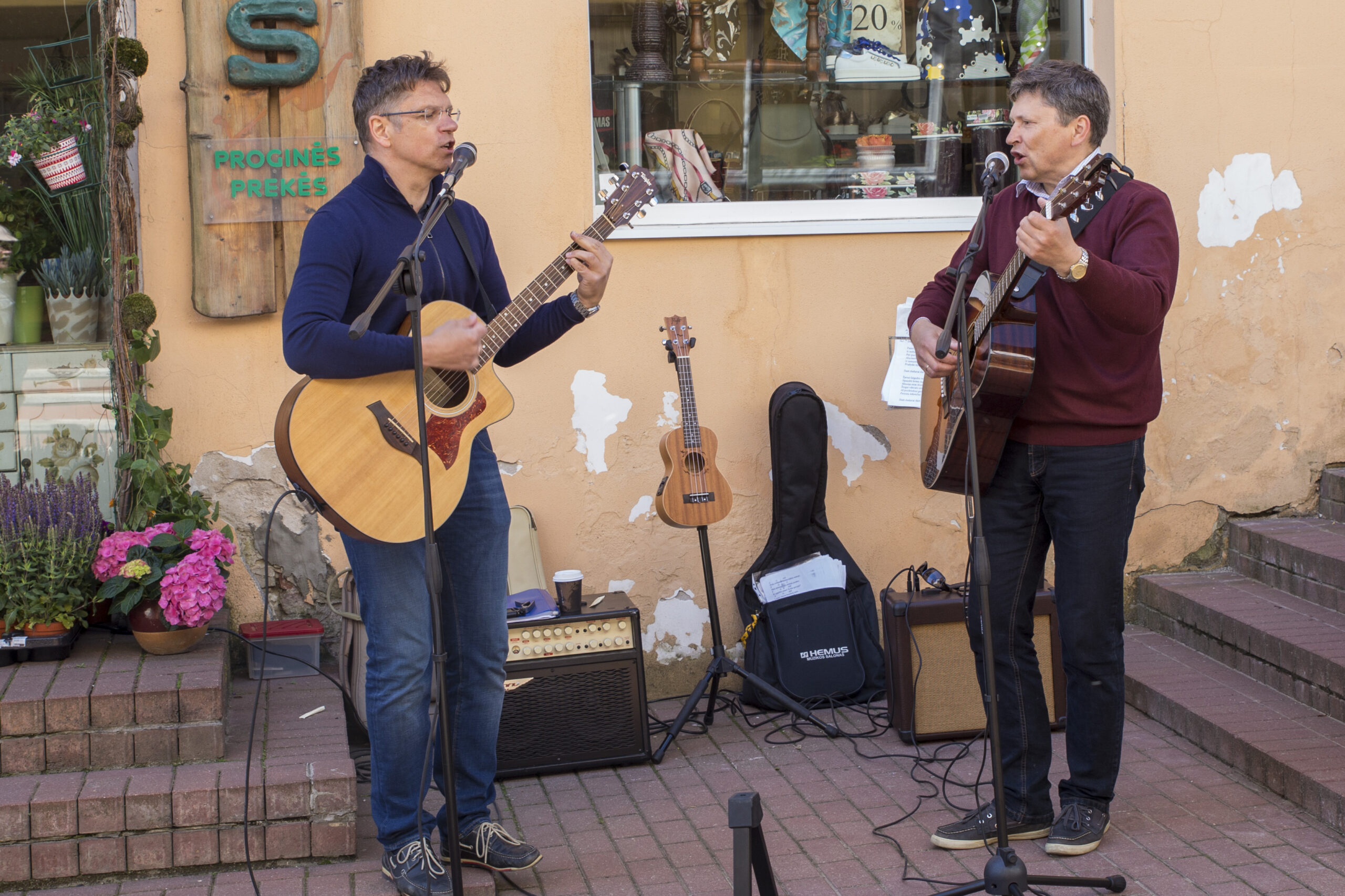 Bene daugiausia simpatijų ir aplodismentų pelnė gitaromis grojantys ir dainuojantys du daugeliui miestiečių puikiai pažįstami muzikantai. Tiesa, pažįstami ne kaip muzikos pasaulio žvaigždės – kiek netikėtame amplua pasirodė vienos didžiausių pramonės įmonių “Schmitz Cargobull Baltic” generalinis direktorius Raimundas Petrauskas bei miesto Tarybos narys ir Panevėžio kolegijos Praktinio mokymo centro vadovas Kęstutis Lukoševičius. Vyrai juokavo, kad gal normalūs žmonės tiek ilgai nesibičiuliauja, bet jie jau daugiau kaip 35-erius metus geriausi draugai – nuo pat studijų laikų. Kartu ne tik keliauja, sportuoja, bet ir muzikuoja. Muzika abiejų jų gyvenime užima didelę dalį – tai ir bendravimų, susitikimų forma, ir saviraiška, ir tiesiog geras laiko praleidimas. Tad ir prie Gatvės muzikos dienos renginių prisijungė tiesiog norėdami gerai praleisti laiką.